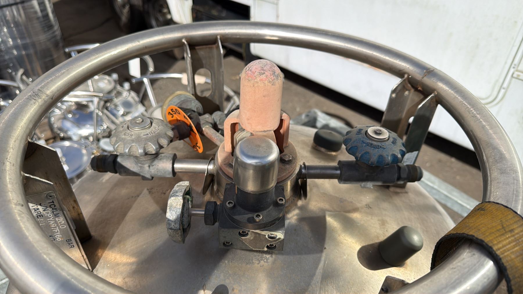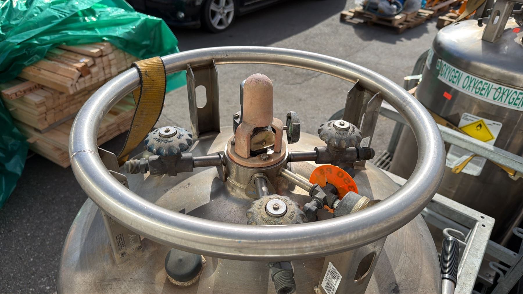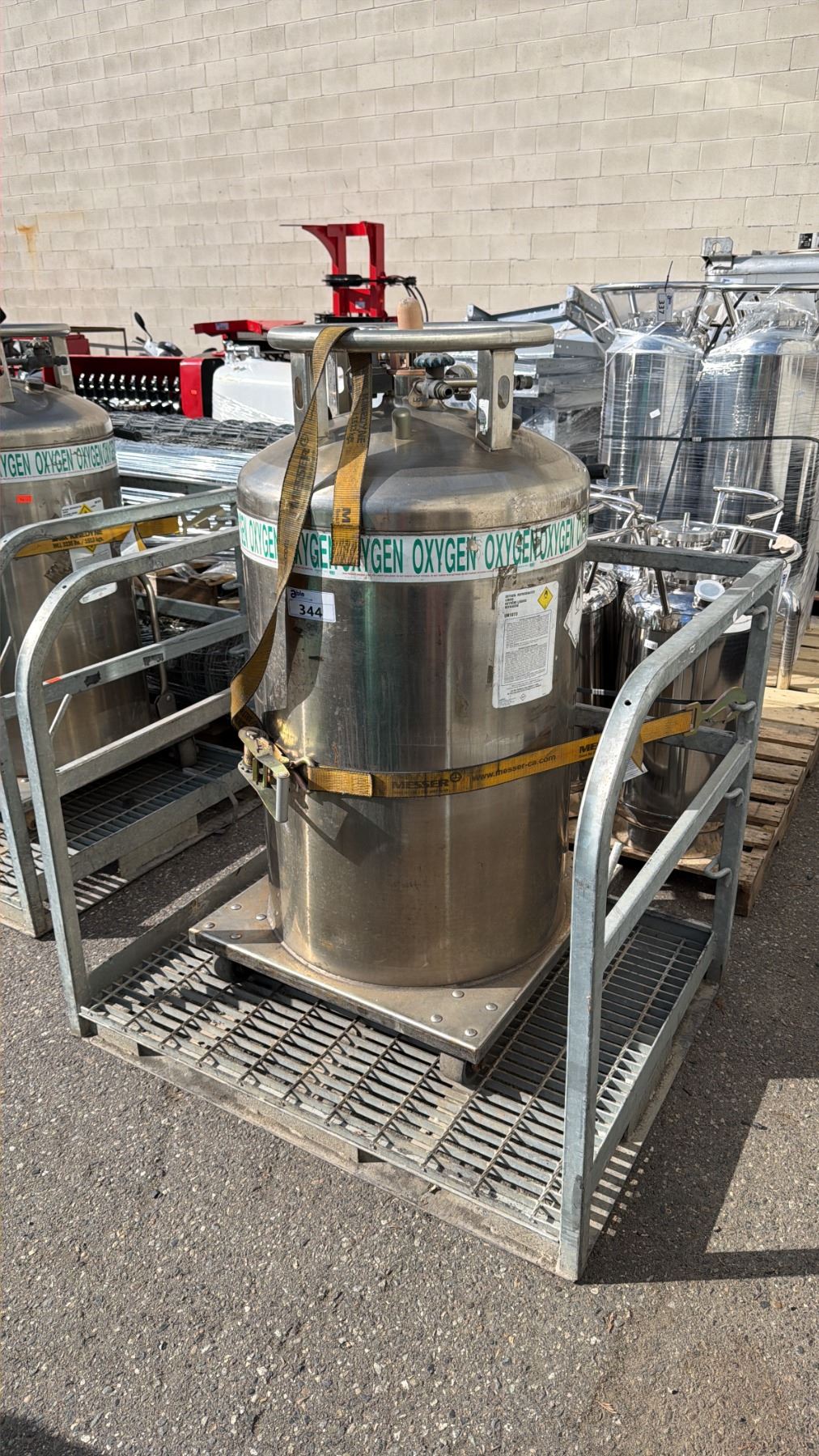 LARGE STAINLESS STEEL MOBILE LABORATORY OXYGEN TANK ON GALVANIZED MAN LIFT PLATFORM