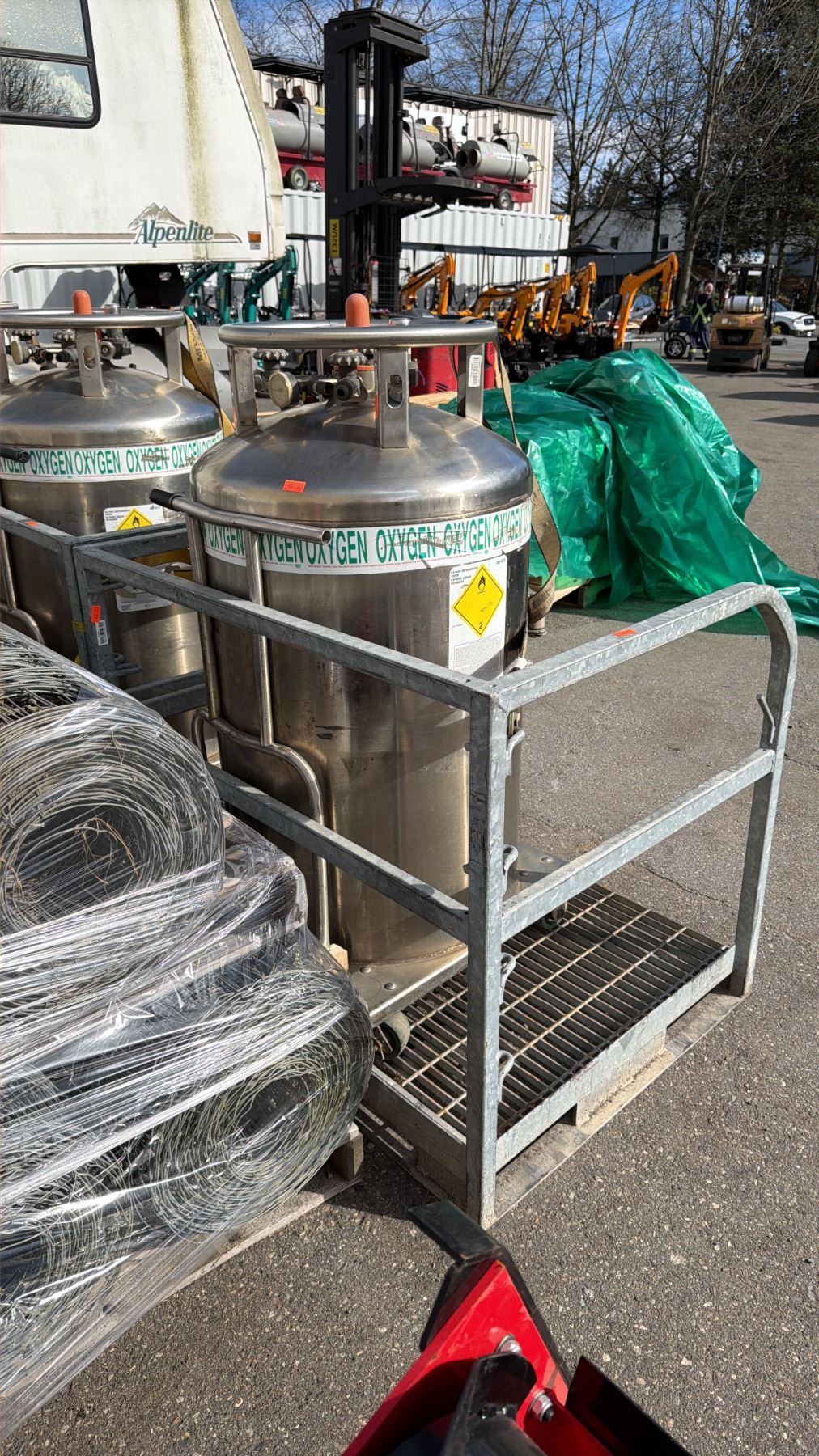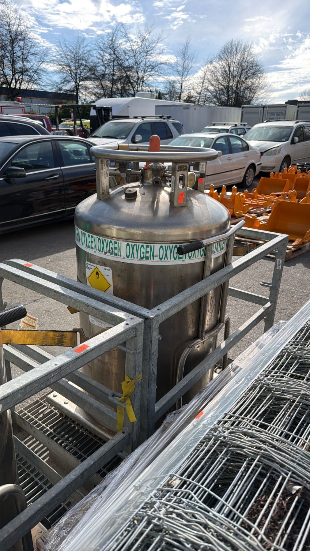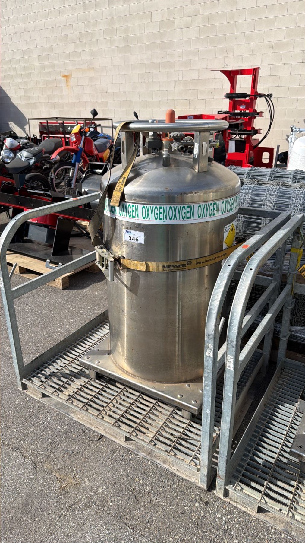 LARGE STAINLESS STEEL MOBILE LABORATORY OXYGEN TANK ON GALVANIZED MAN LIFT PLATFORM TANK MEASURES APPROX 24" ACROSS, 54"H PLATFORM MEASURES APPROX 45" X 36" X 39"H