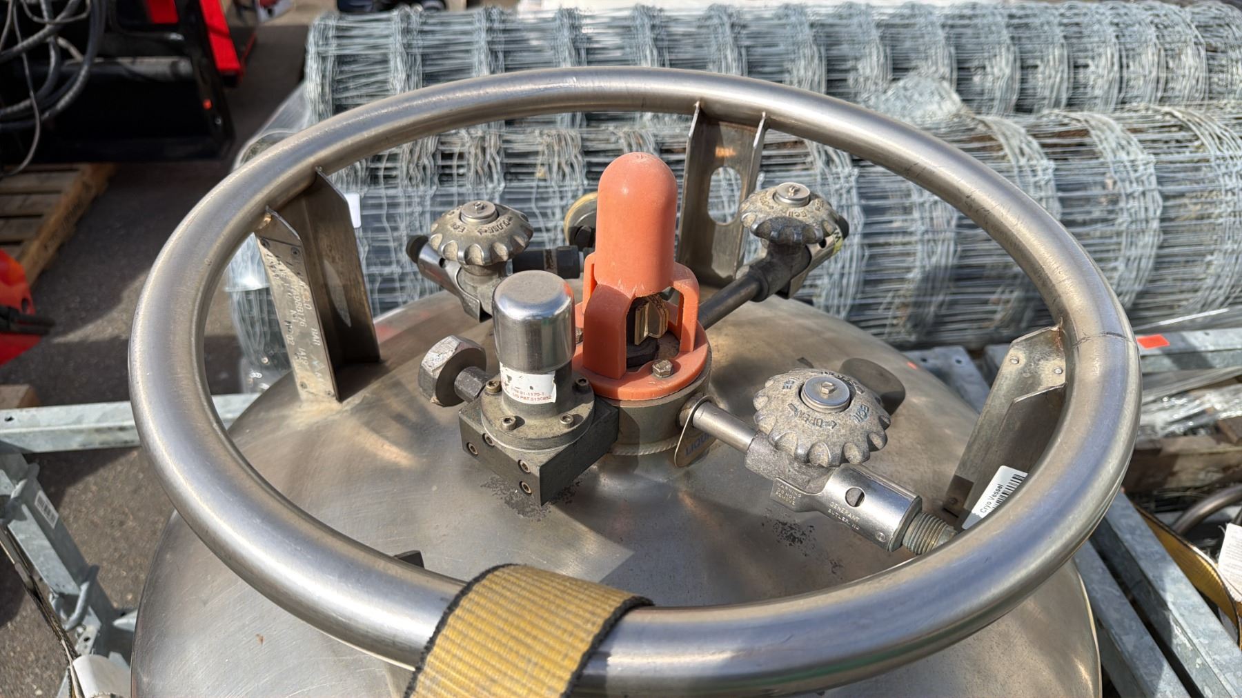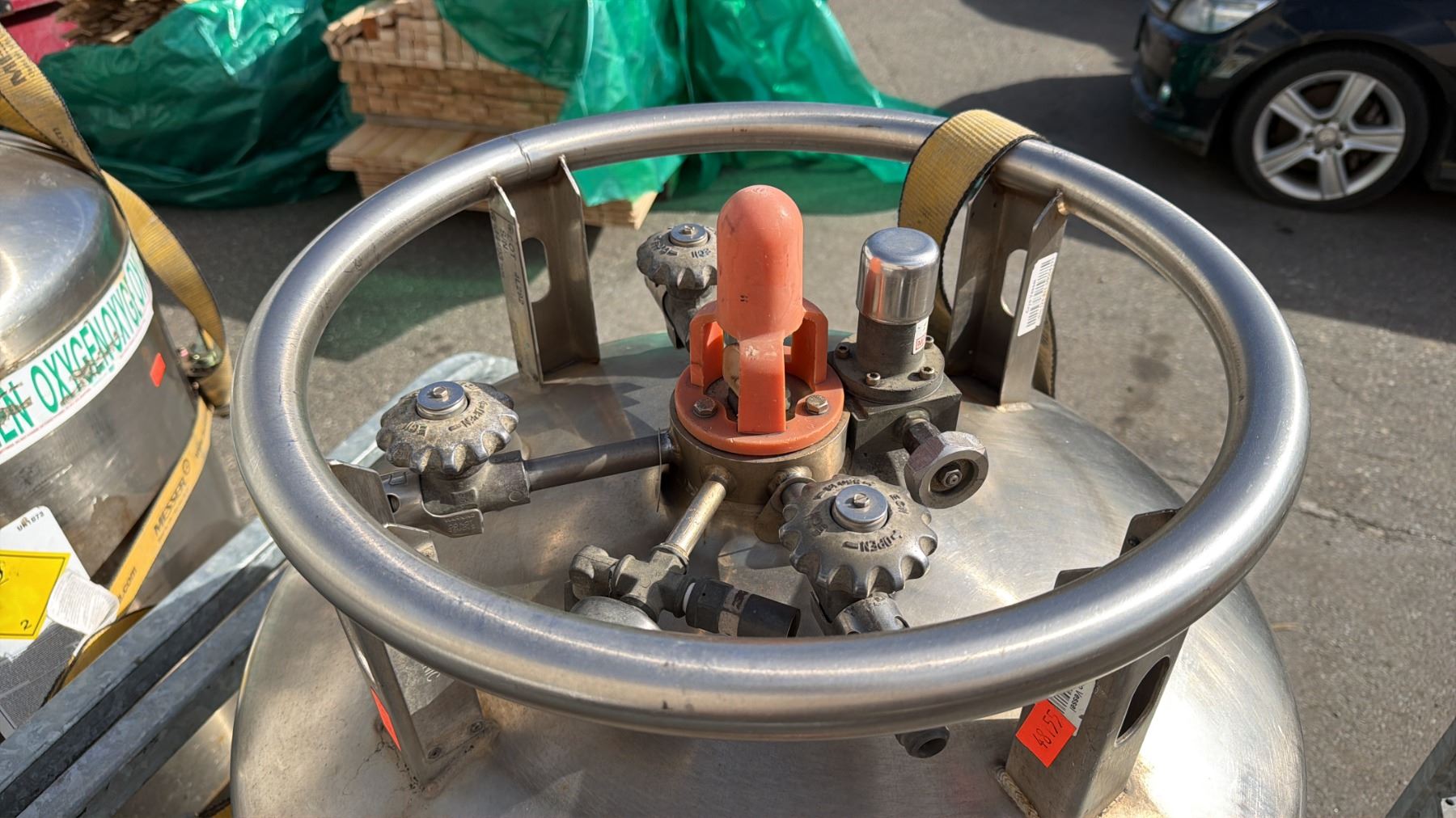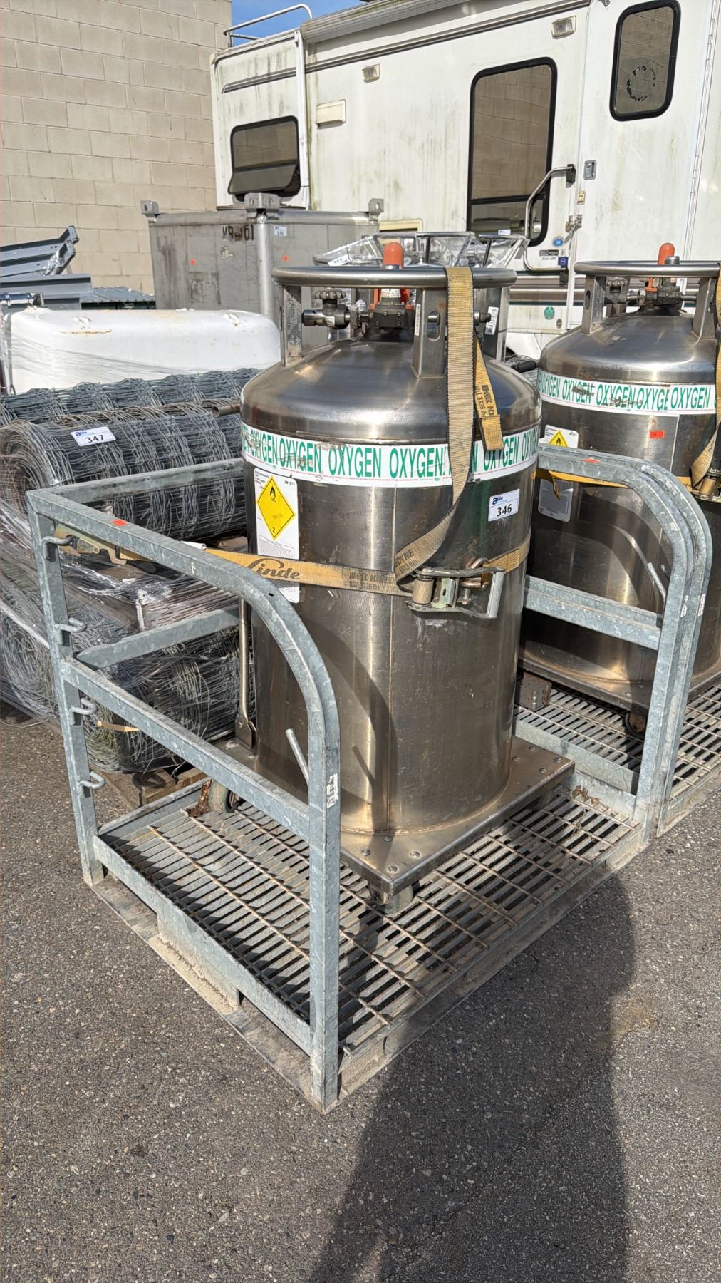 LARGE STAINLESS STEEL MOBILE LABORATORY OXYGEN TANK ON GALVANIZED MAN LIFT PLATFORM TANK MEASURES APPROX 24" ACROSS, 54"H PLATFORM MEASURES APPROX 45" X 36" X 39"H