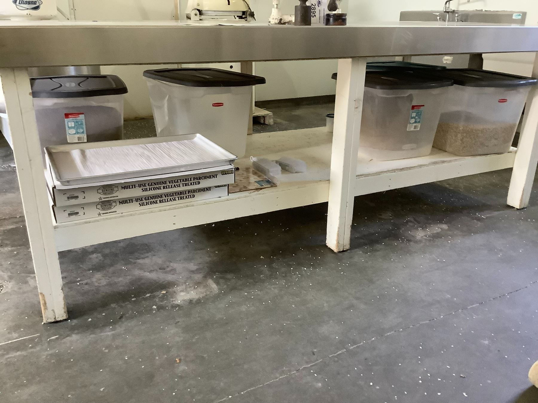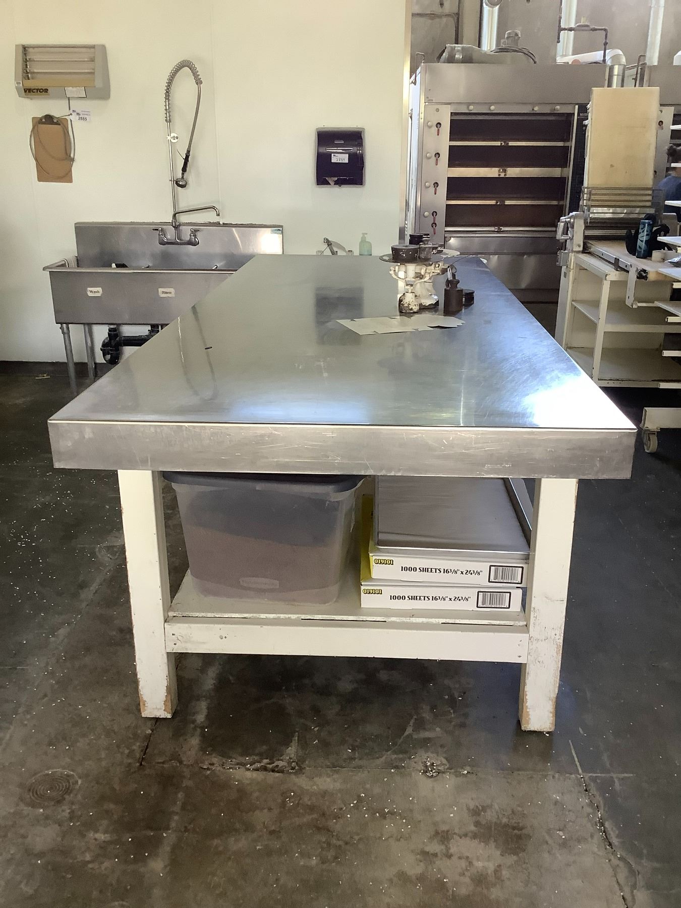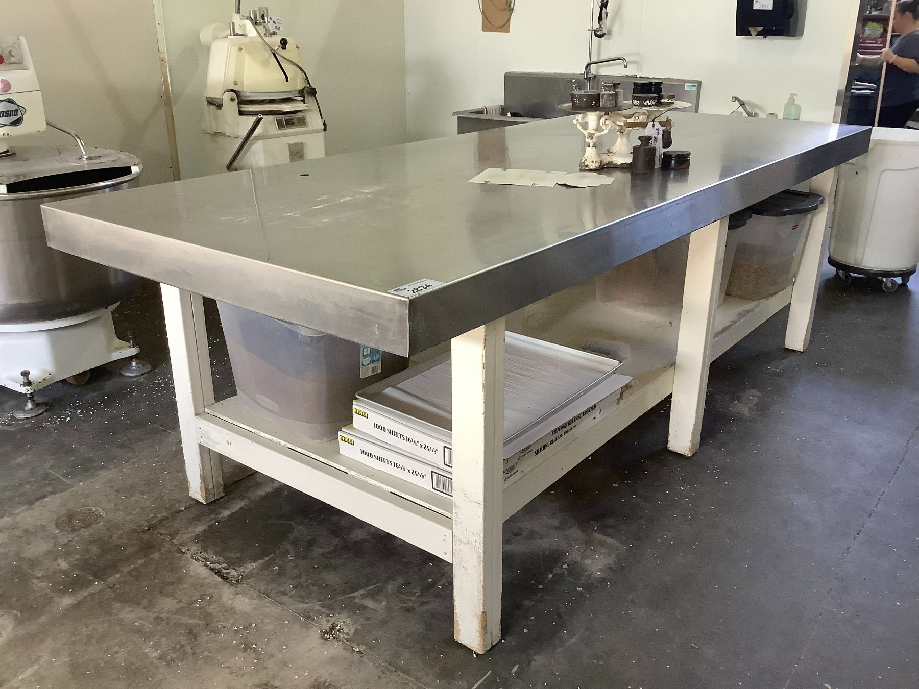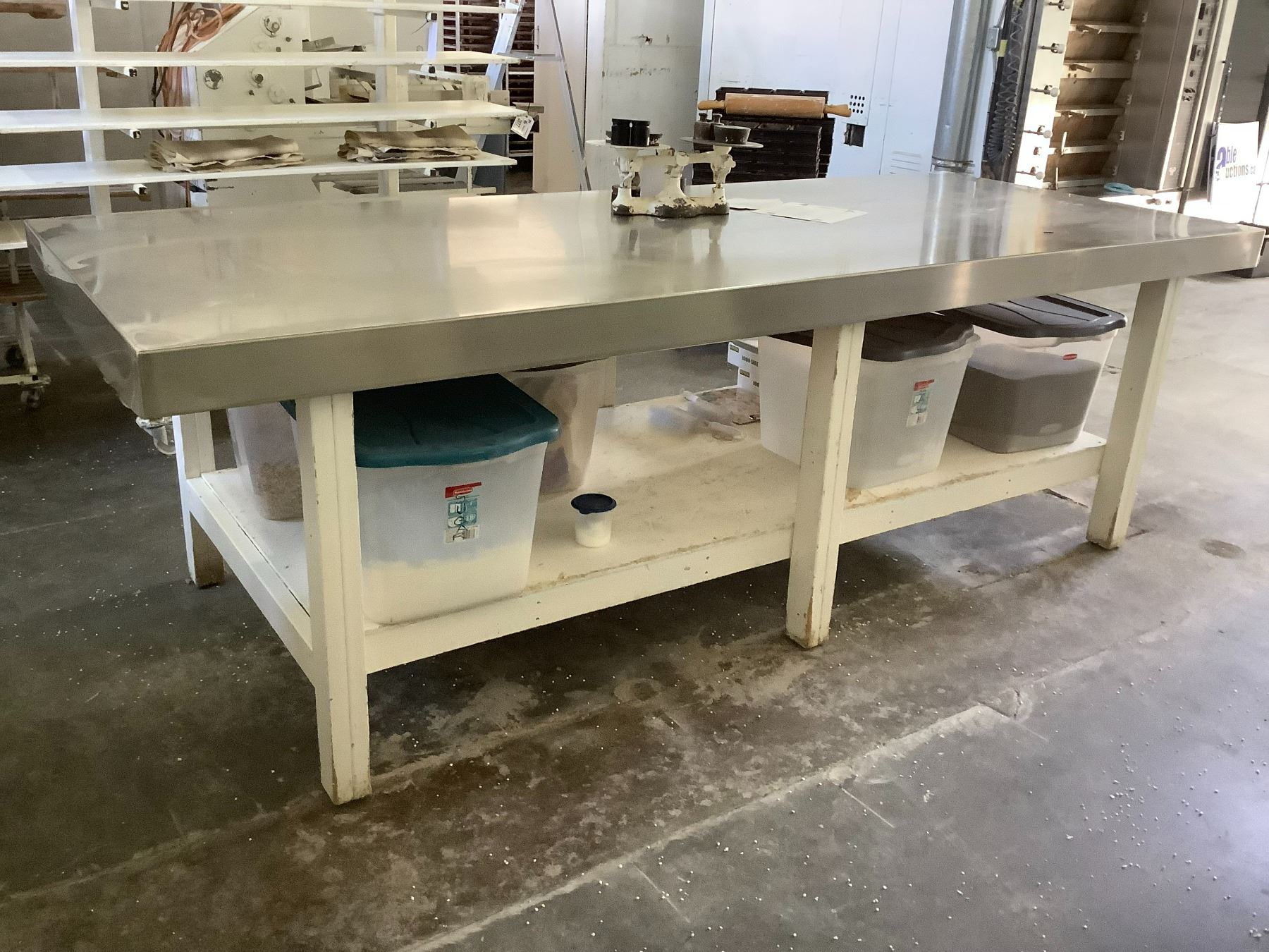 LARGE STAINLESS STEEL & WOOD PREP TABLE WITH CONTENTS UNDERNEATH 120"X48"38"H