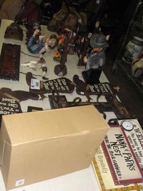 LARGE TABLE LOT OF COWBOY RELATED ITEMS AND PLAQUES