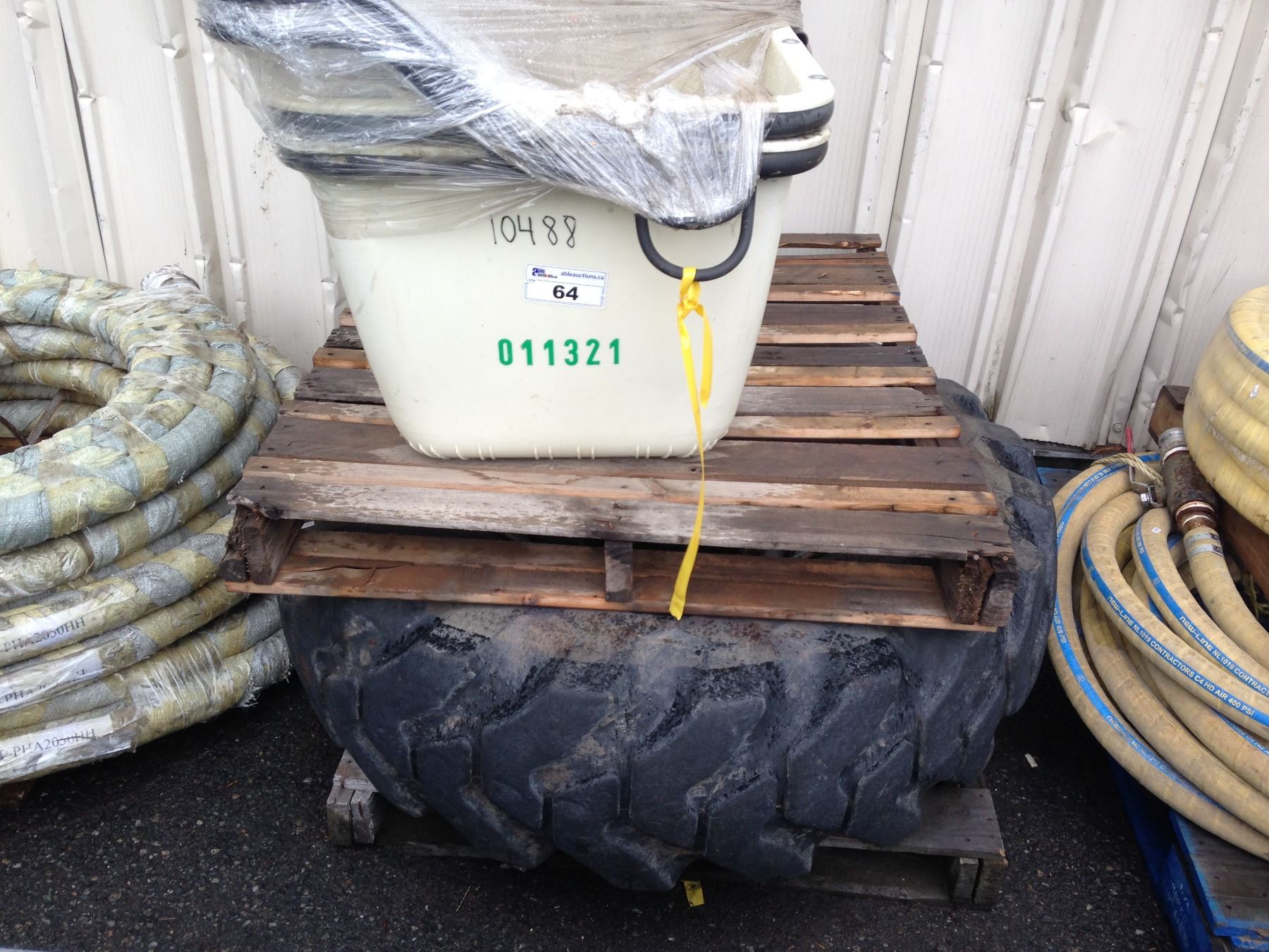 LARGE TRACTOR TIRE & PALLET OF CONSTRUCTION BINS AND PARTS