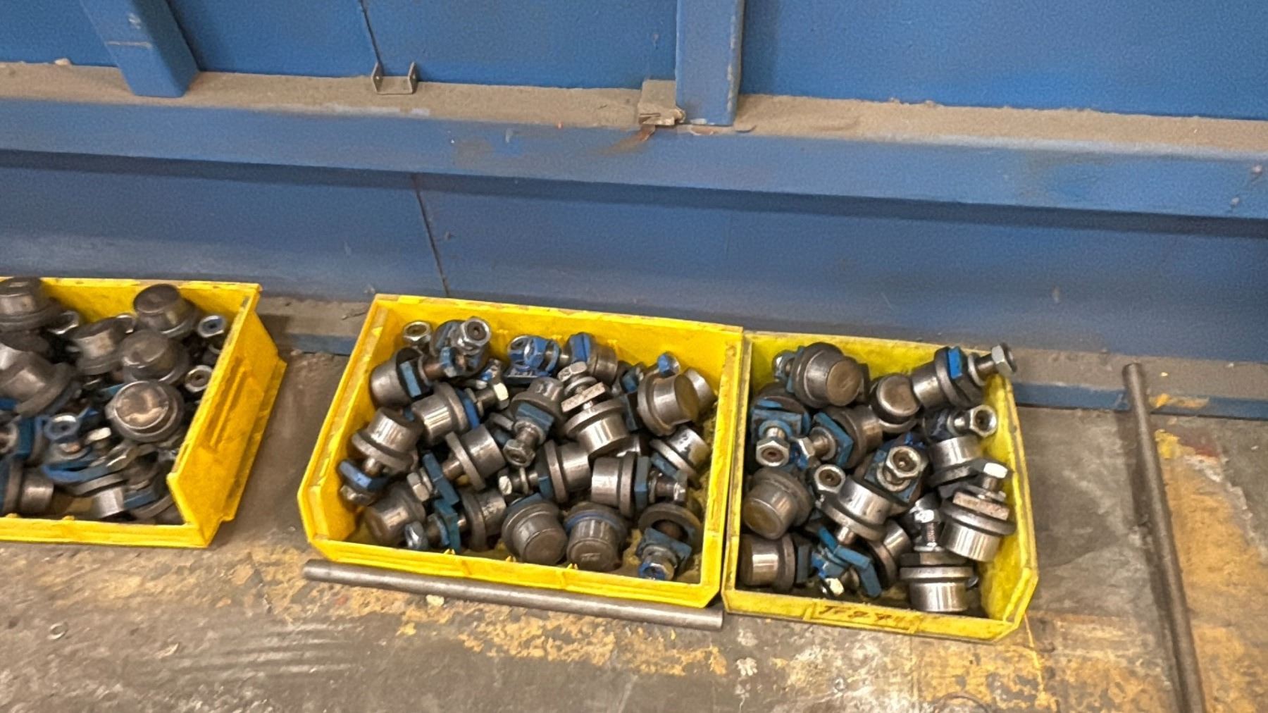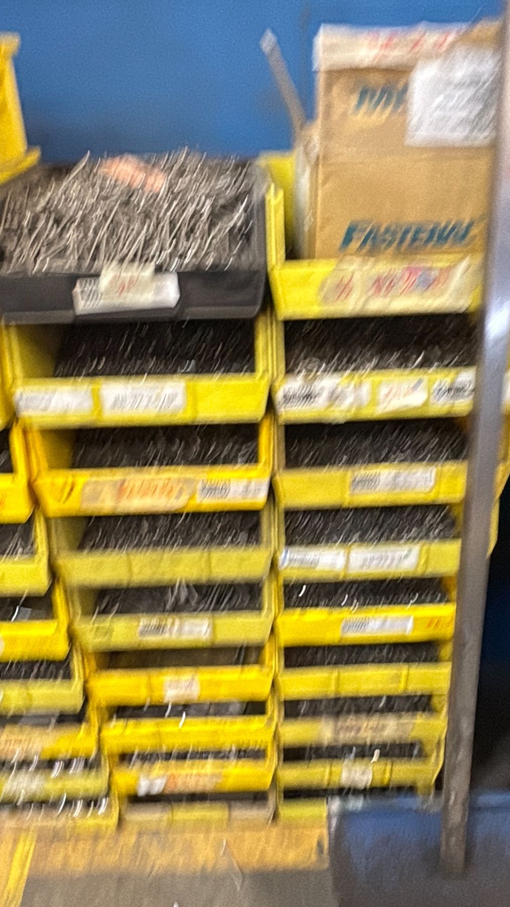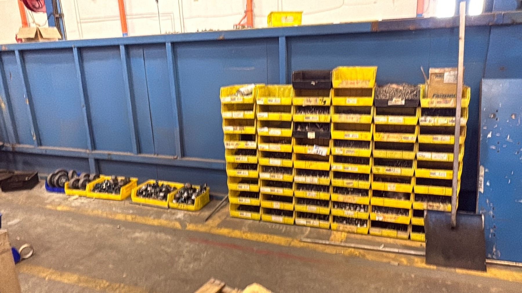 LARGE VOLUME OF PARTS BINS WITH CONTENTS; SS FITTINGS, NUTS, BOLTS AND CASTER WHEELS