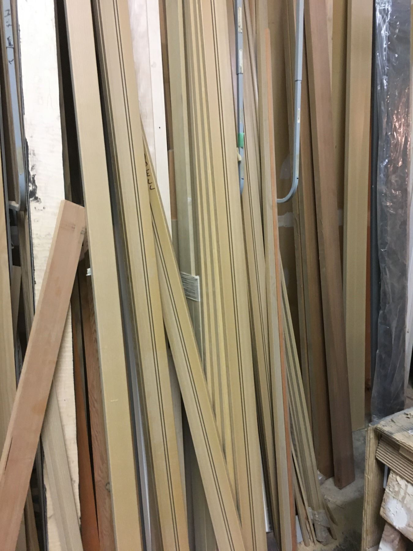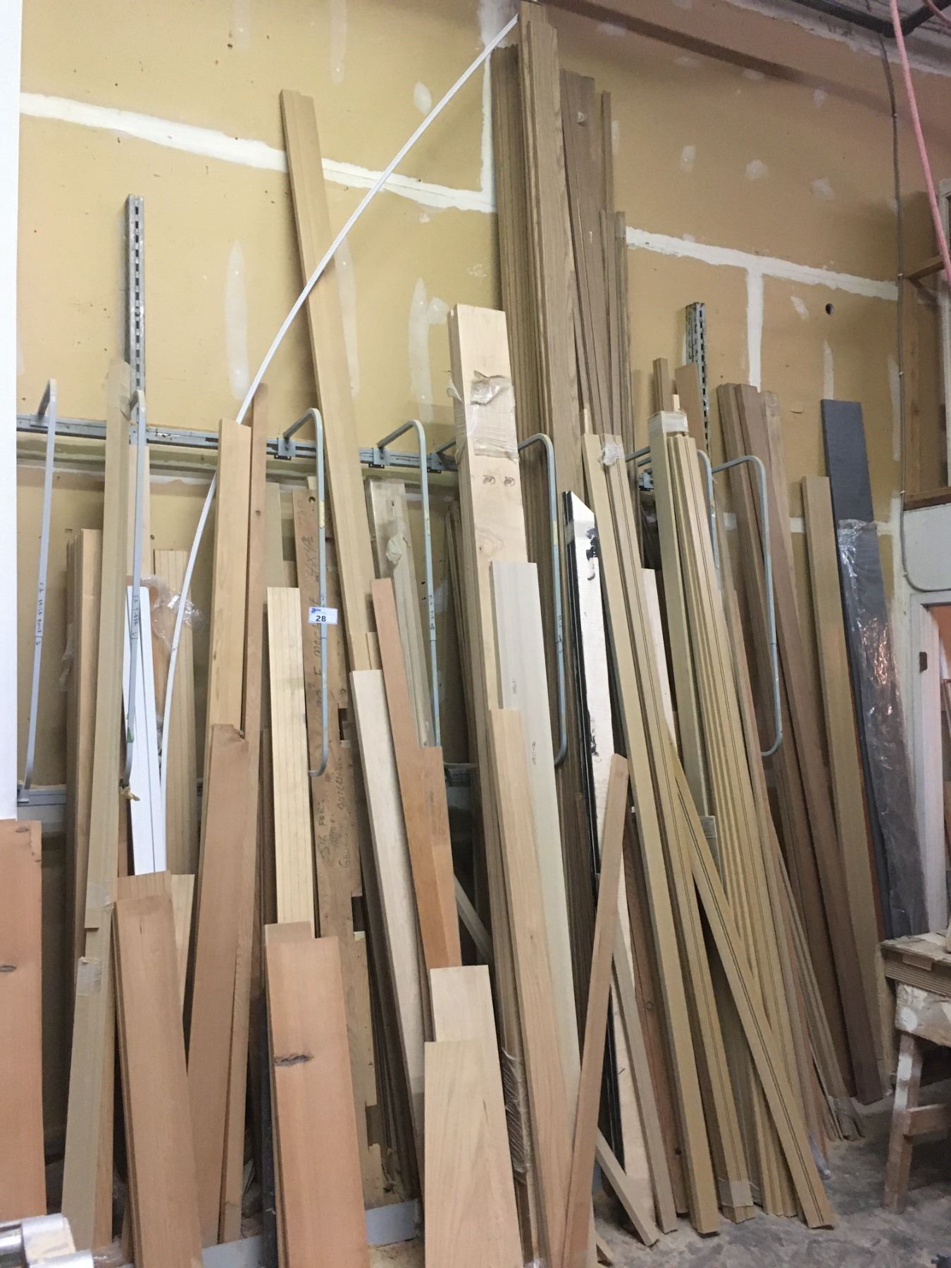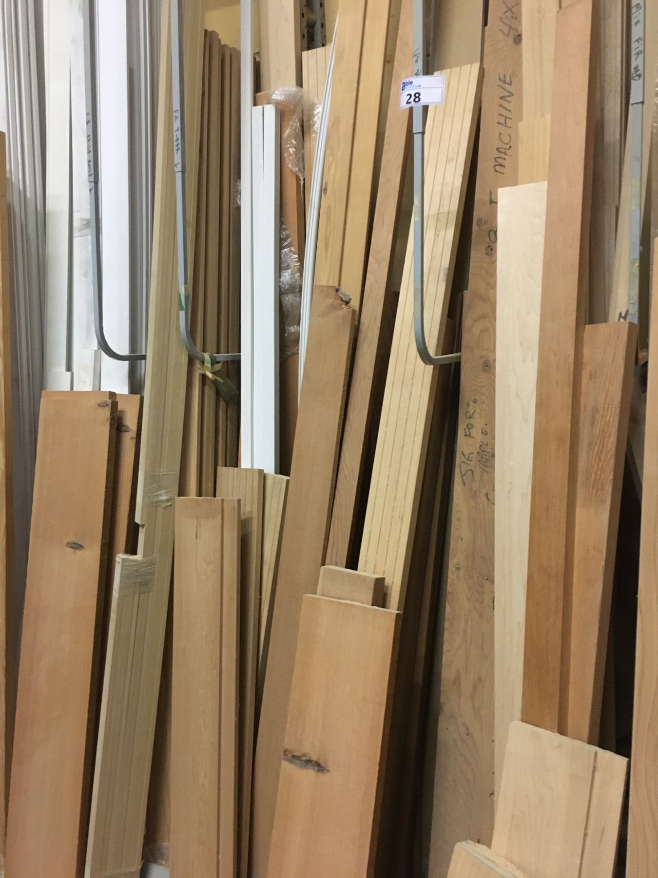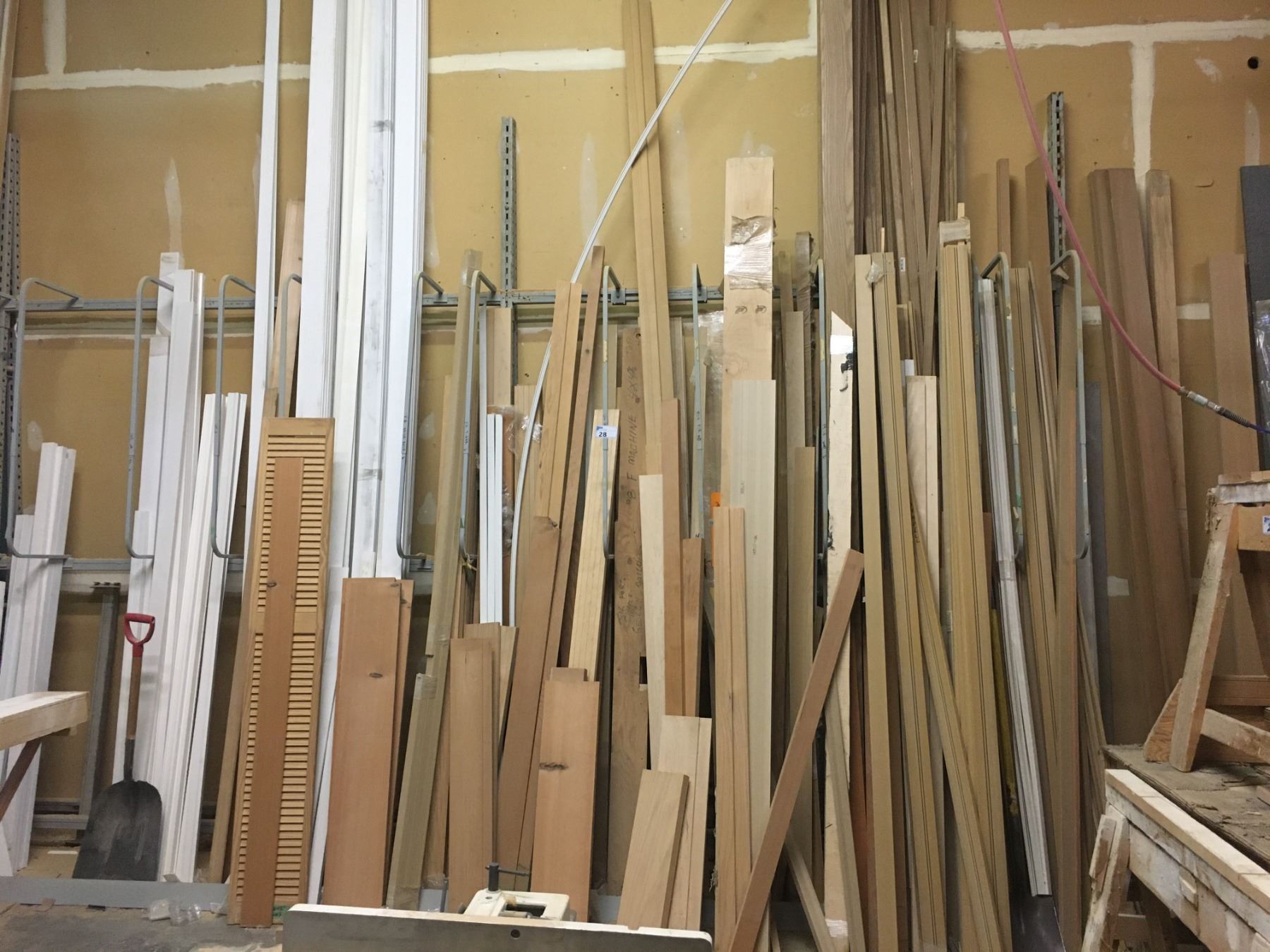 LARGE WALL RACK OF DOOR FRAME MATERIAL, SAW HORSES, BENCH WITH CONTENTS, ROOM OF ASSORTED GLASS PANELS AND WALL RACK MATERIAL STORAGE UNIT