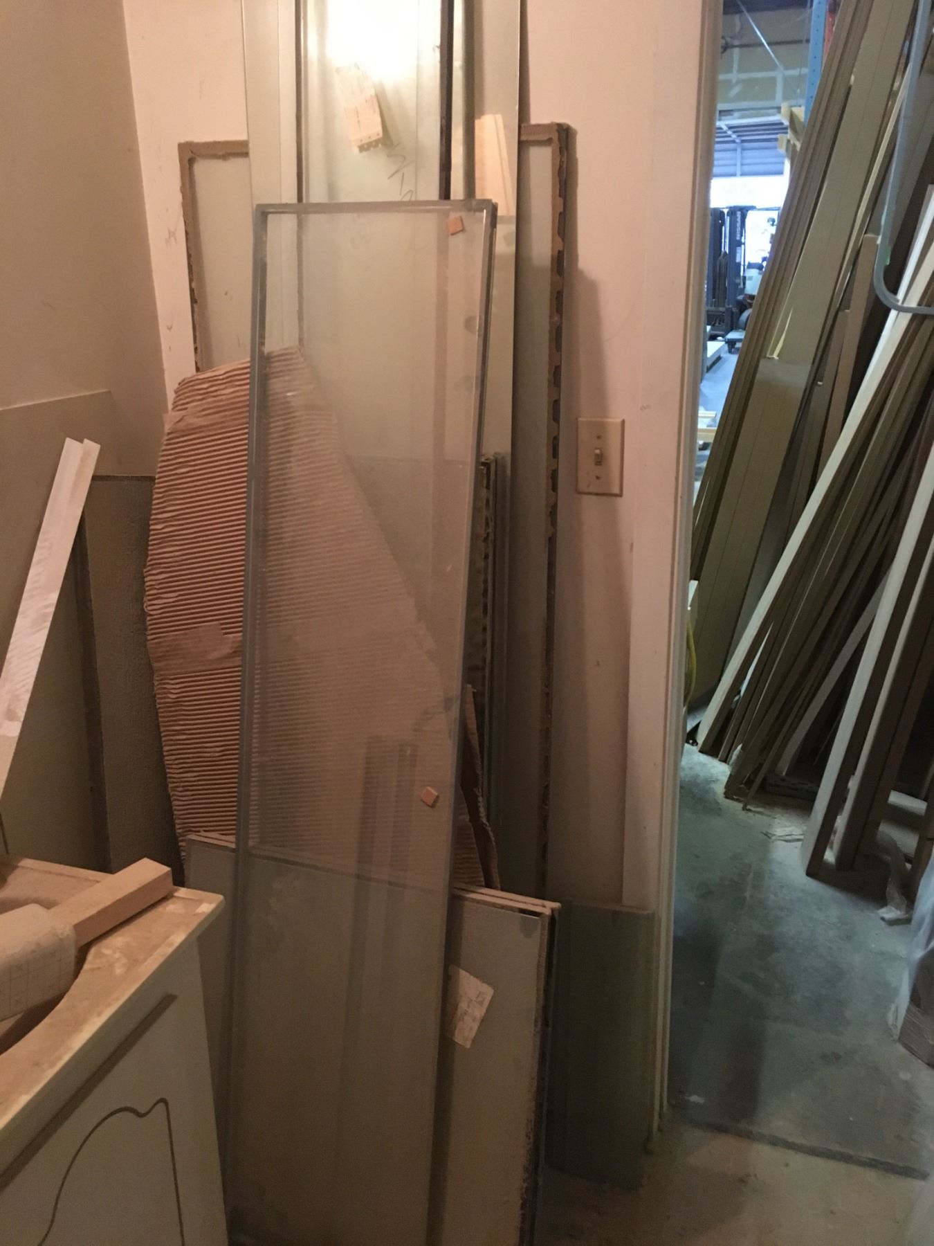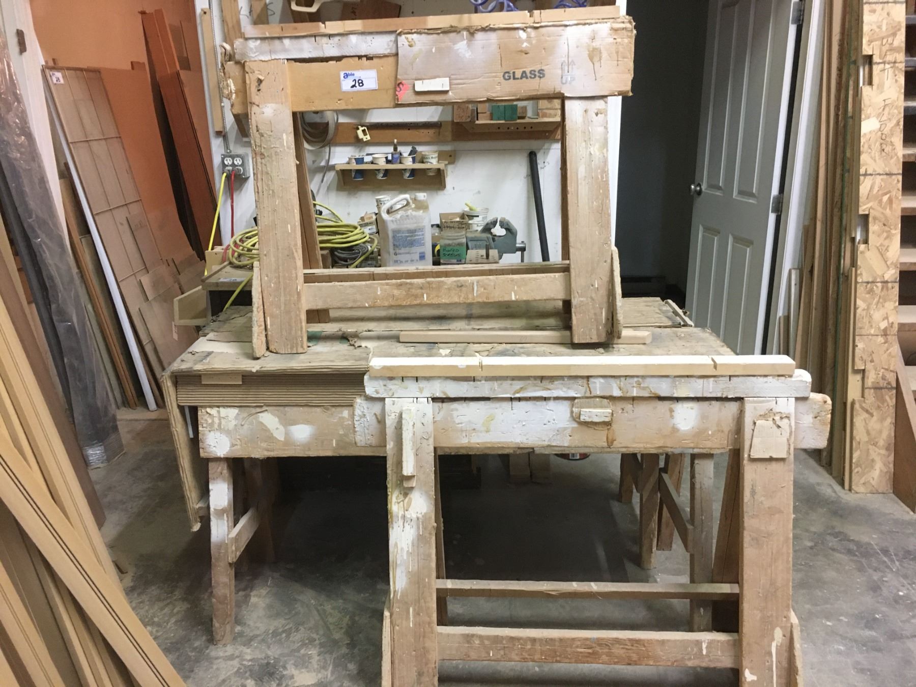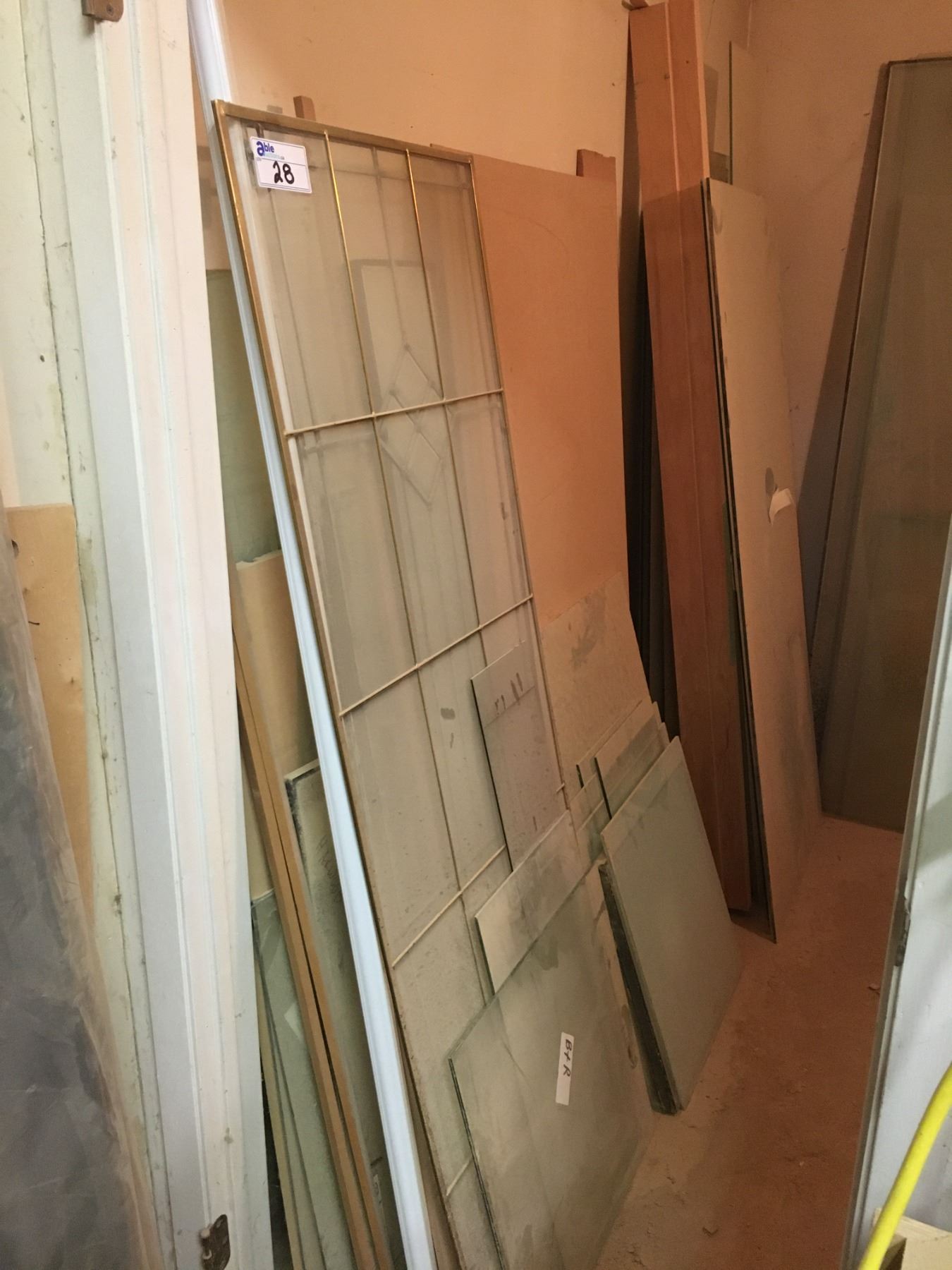 LARGE WALL RACK OF DOOR FRAME MATERIAL, SAW HORSES, BENCH WITH CONTENTS, ROOM OF ASSORTED GLASS