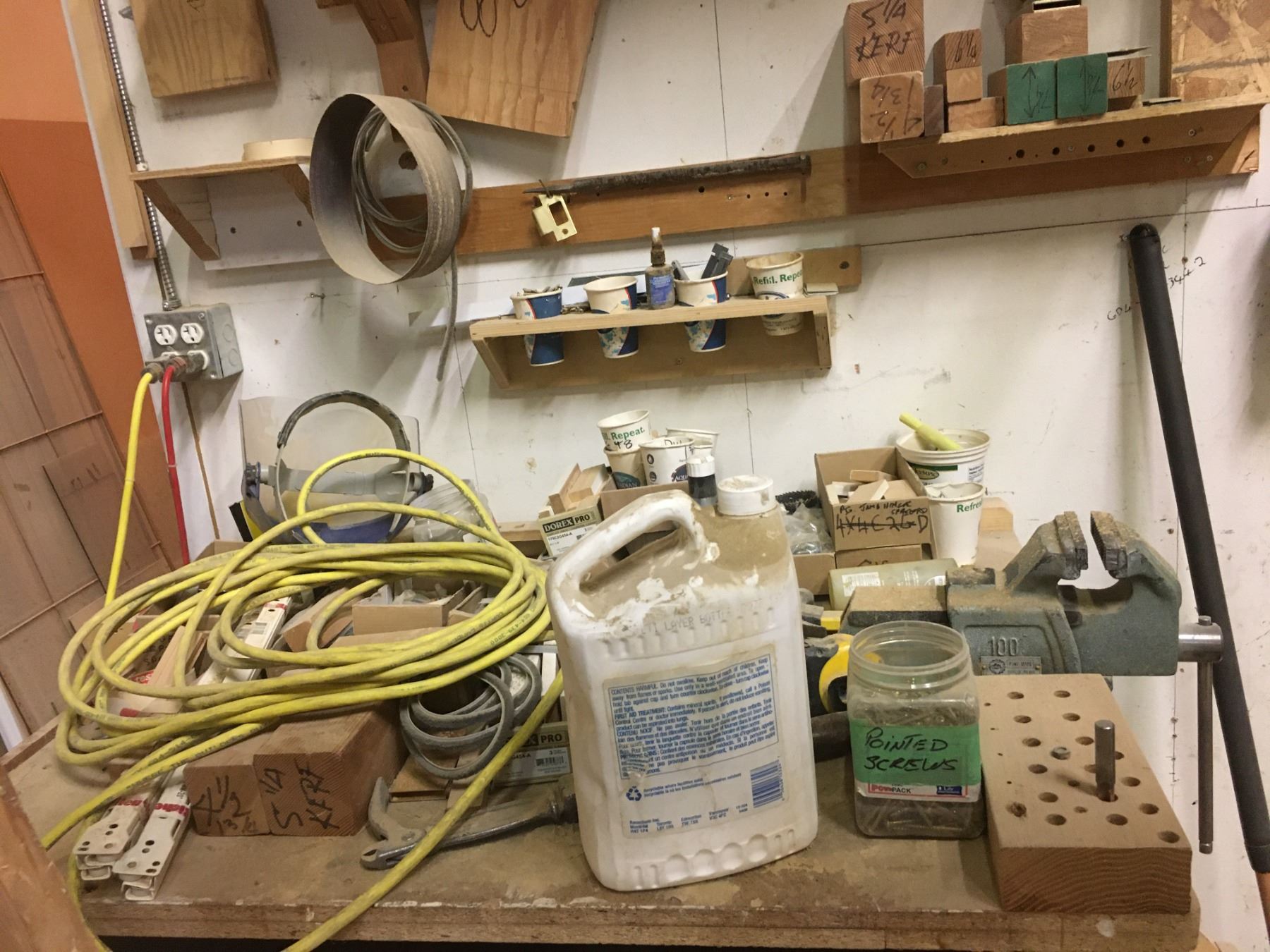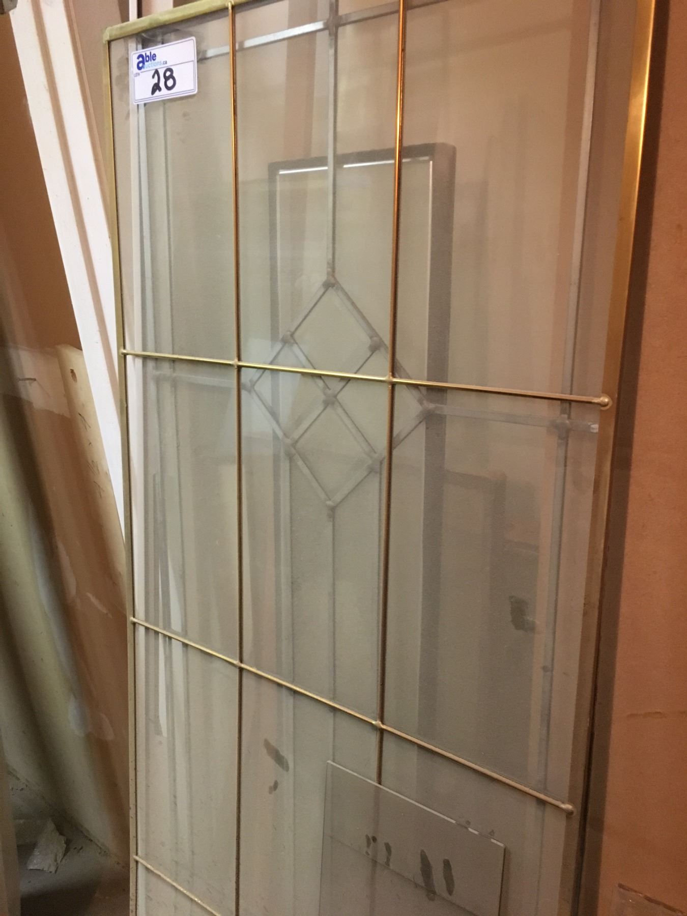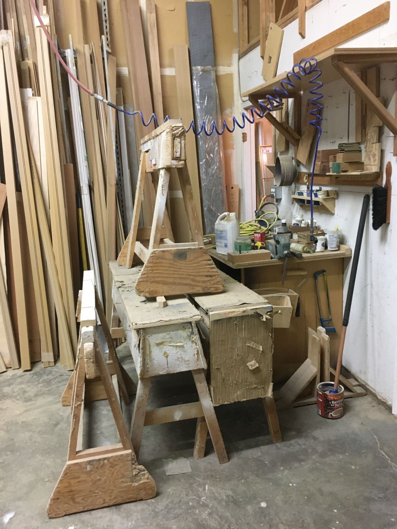 LARGE WALL RACK OF DOOR FRAME MATERIAL, SAW HORSES, BENCH WITH CONTENTS, ROOM OF ASSORTED GLASS