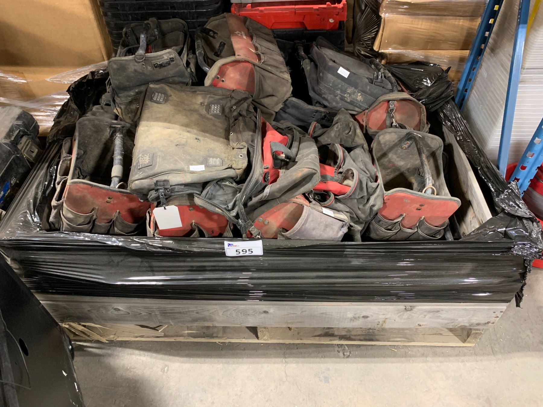 LARGE WOOD BIN FULL OF HUSKY INDUSTRIAL TOOL CARRY BAGS