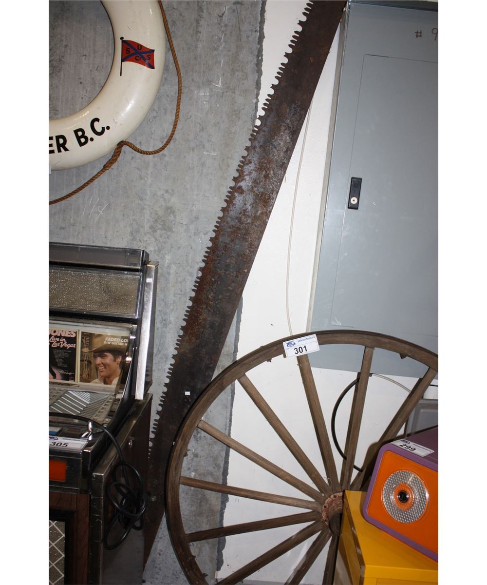 LARGE WOOD SPOKED WAGON WHEEL AND A TWO HANDLED TWO MAN WOOD SAW