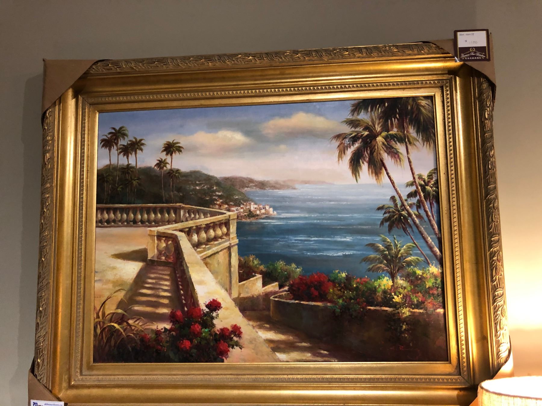 LARGE WOODEN FRAME PAINTED ARTWORK - SEASIDE RETREAT