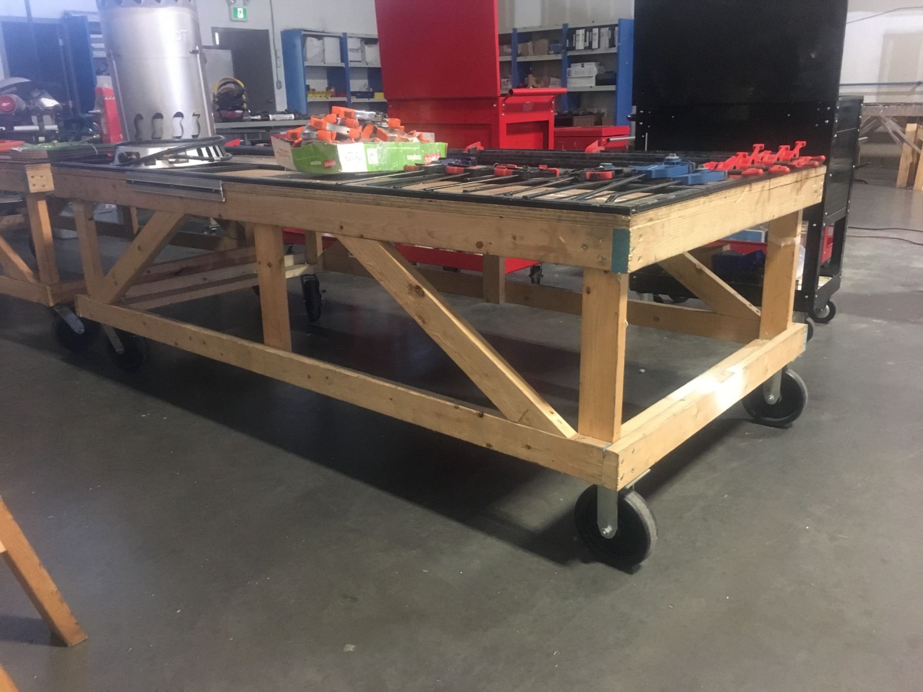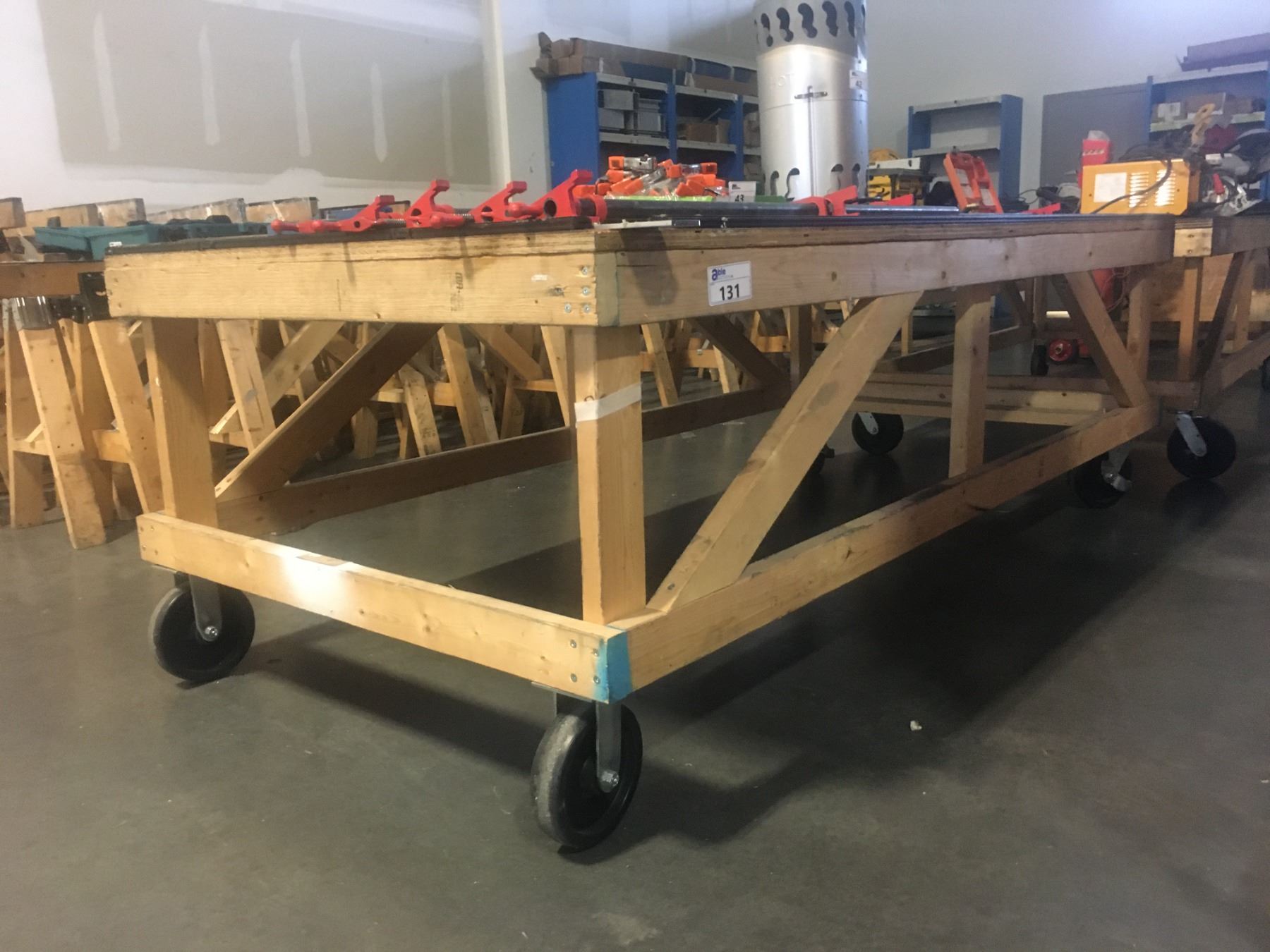 LARGE WOODEN ROLLING WORK TABLE - APPROX. 4FT X 8FT X 2 1/2FT HIGH