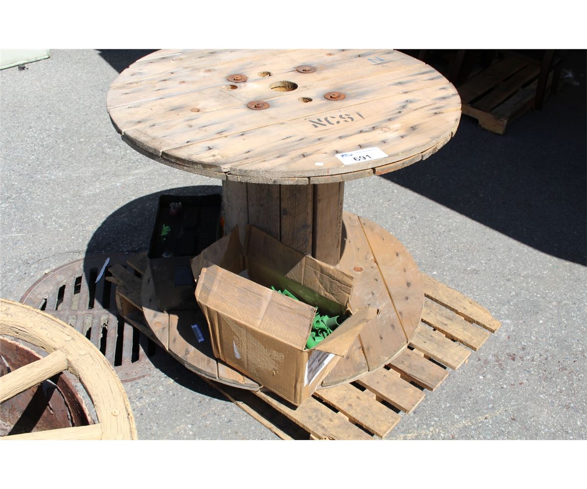 LARGE WOODEN SPOOL, 12V BATTERY AND BOX OF GREEN METAL FASTENERS