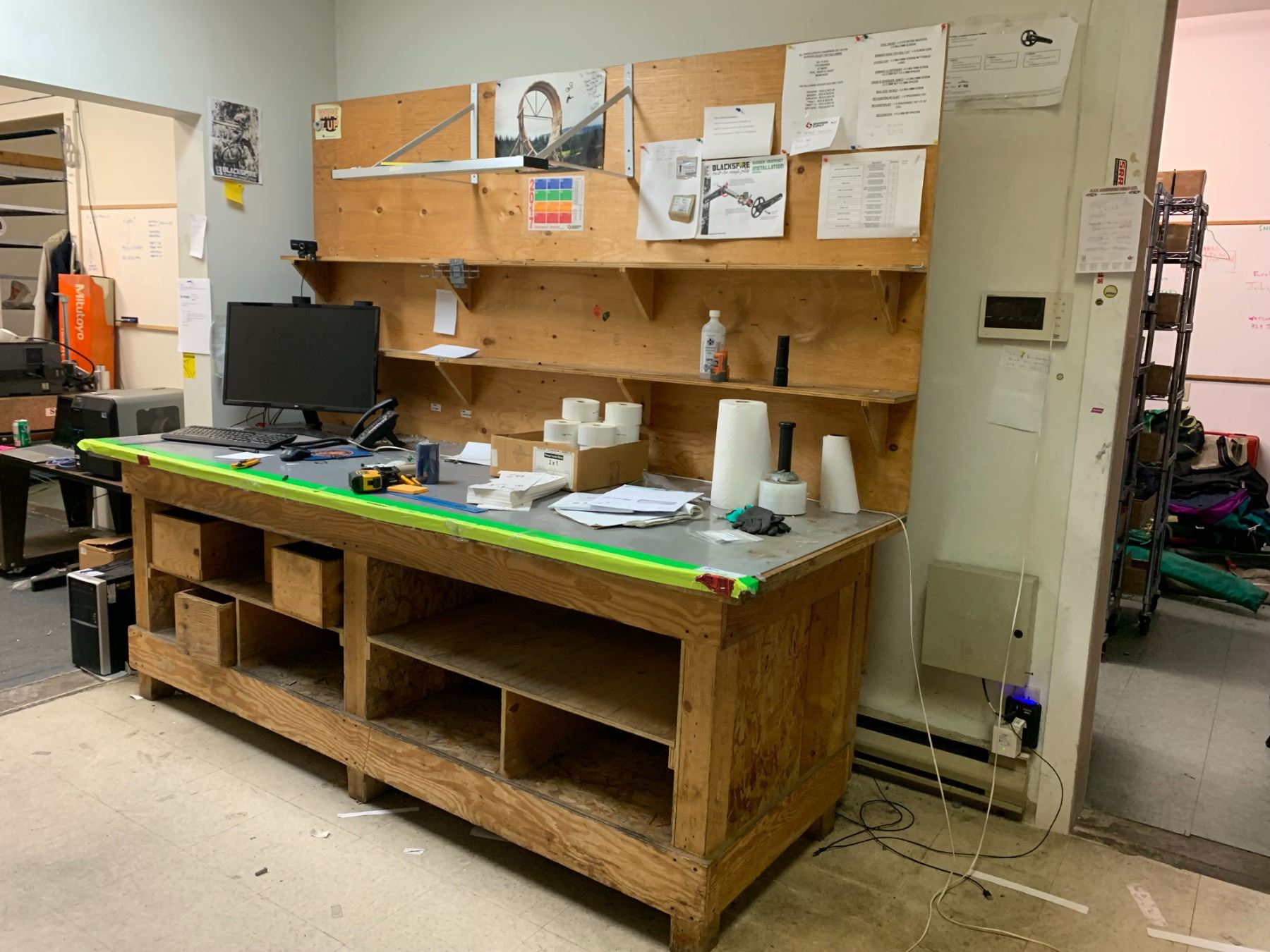 LARGE WOODEN WORK BENCH-APPROX 8FT ACROSS X 3 1/2FT WIDE X 7FT TALL