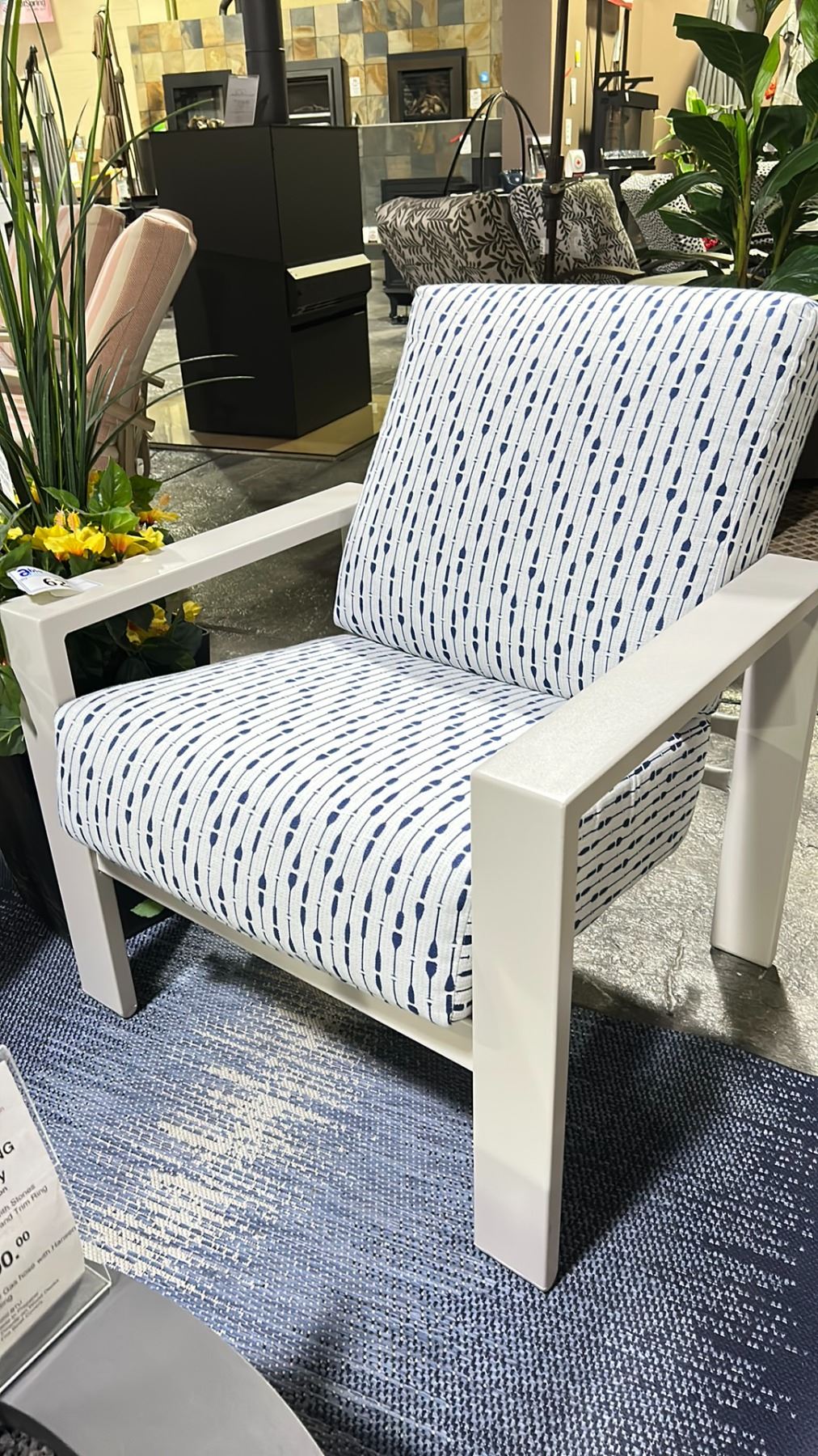 LARSSEN CUSHION ARM CHAIR WITH WARM GREY FRAME AND ORDERLY LINES NAUTICAL FABRIC. TEXTURED POWDER COATED ALUMINUM FRAME. RETAIL PRICE $1950