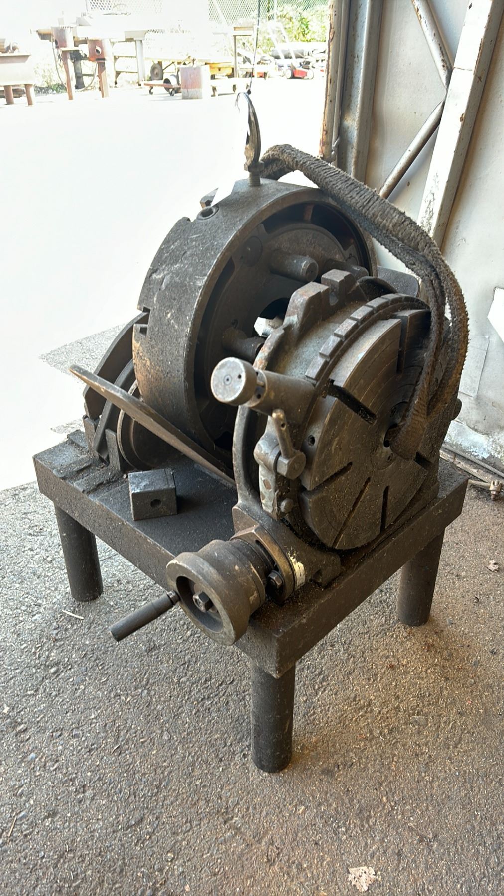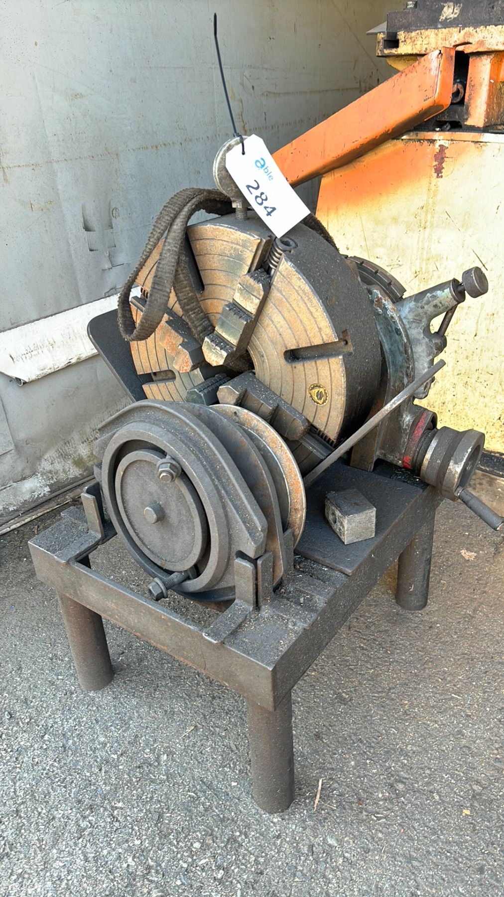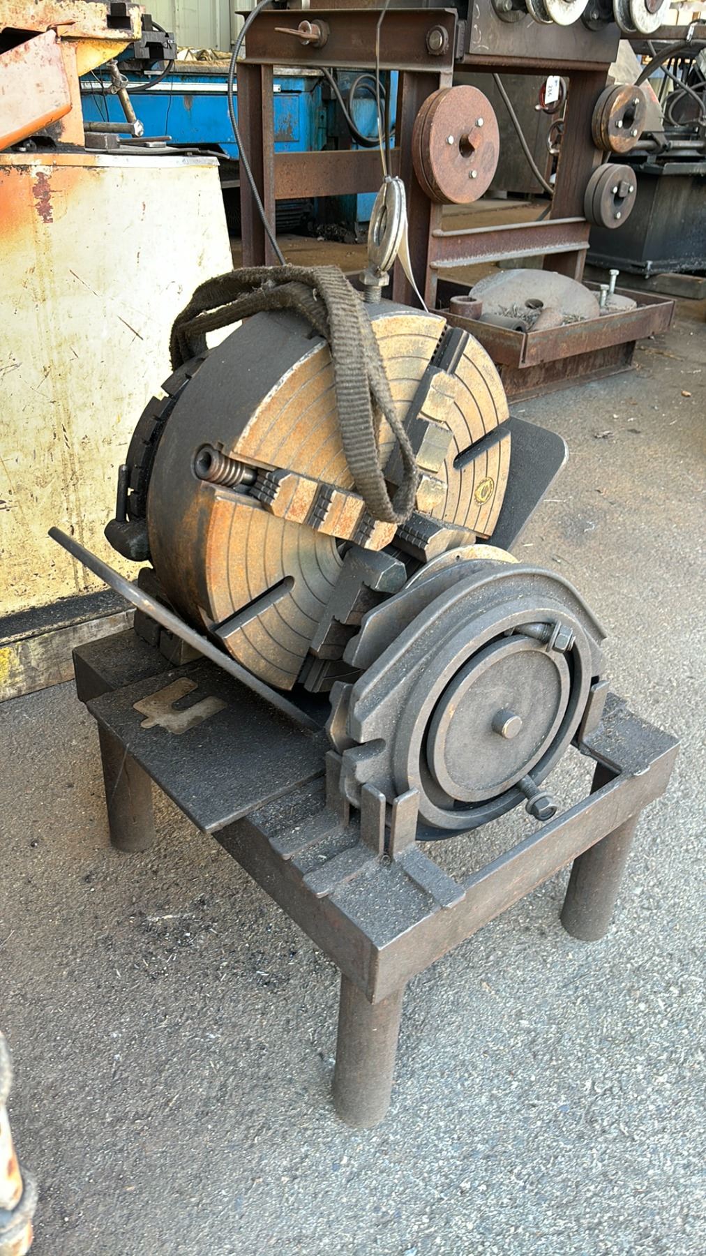 LATHE CHUCKS AND PARTS ON METAL STORAGE STAND