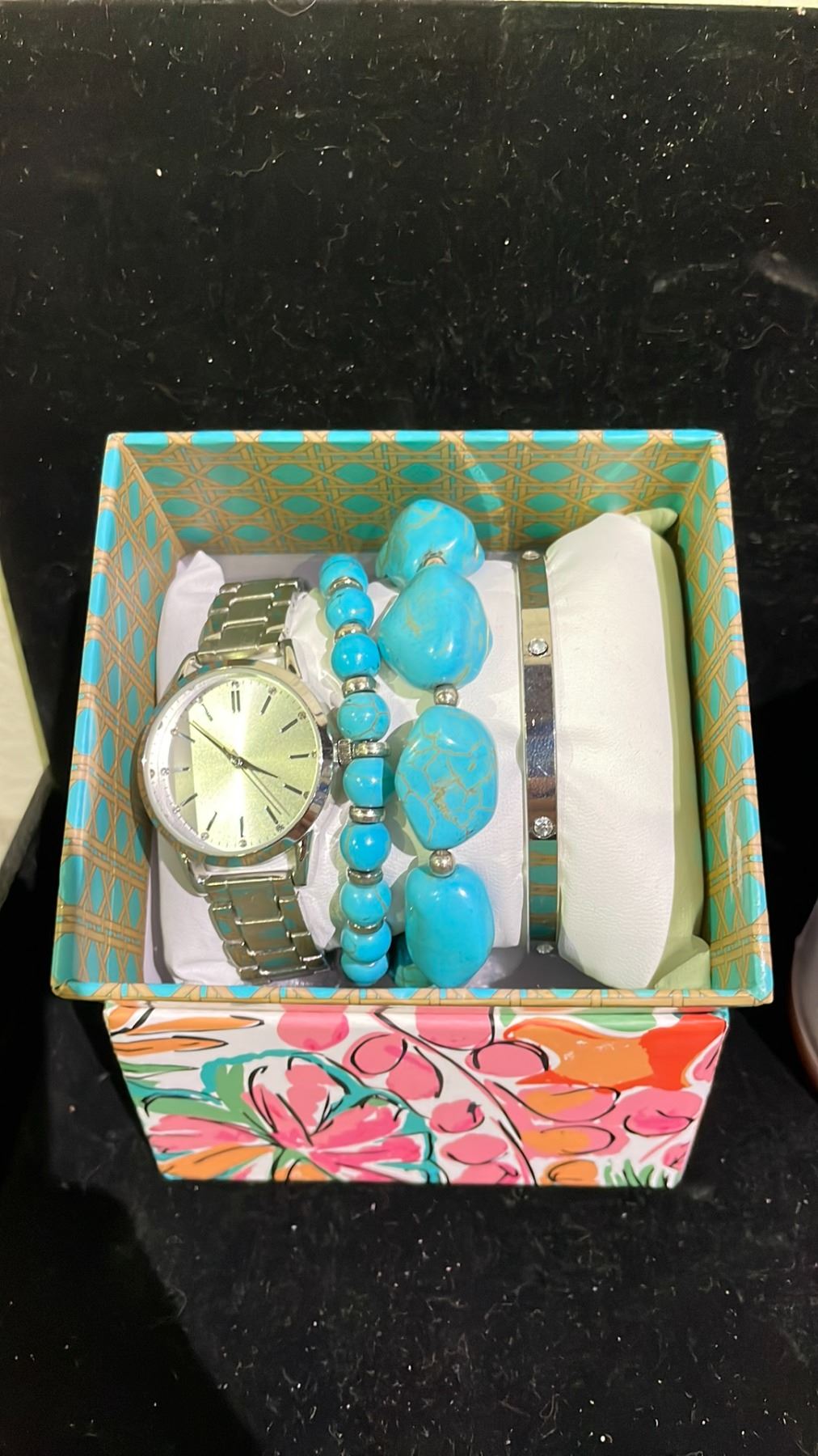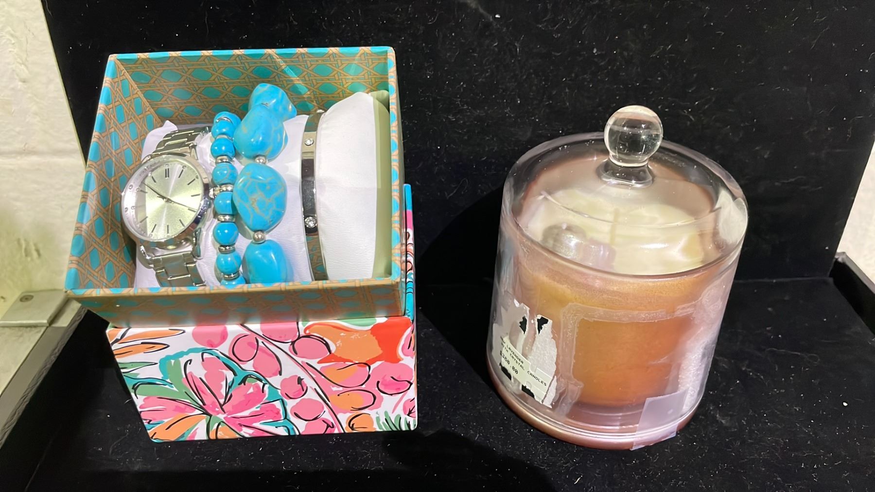 LAVENDER WITH CRYSTAL CANDLE RETAIL $380, AND WATCH WITH FAUX TURQUOISE