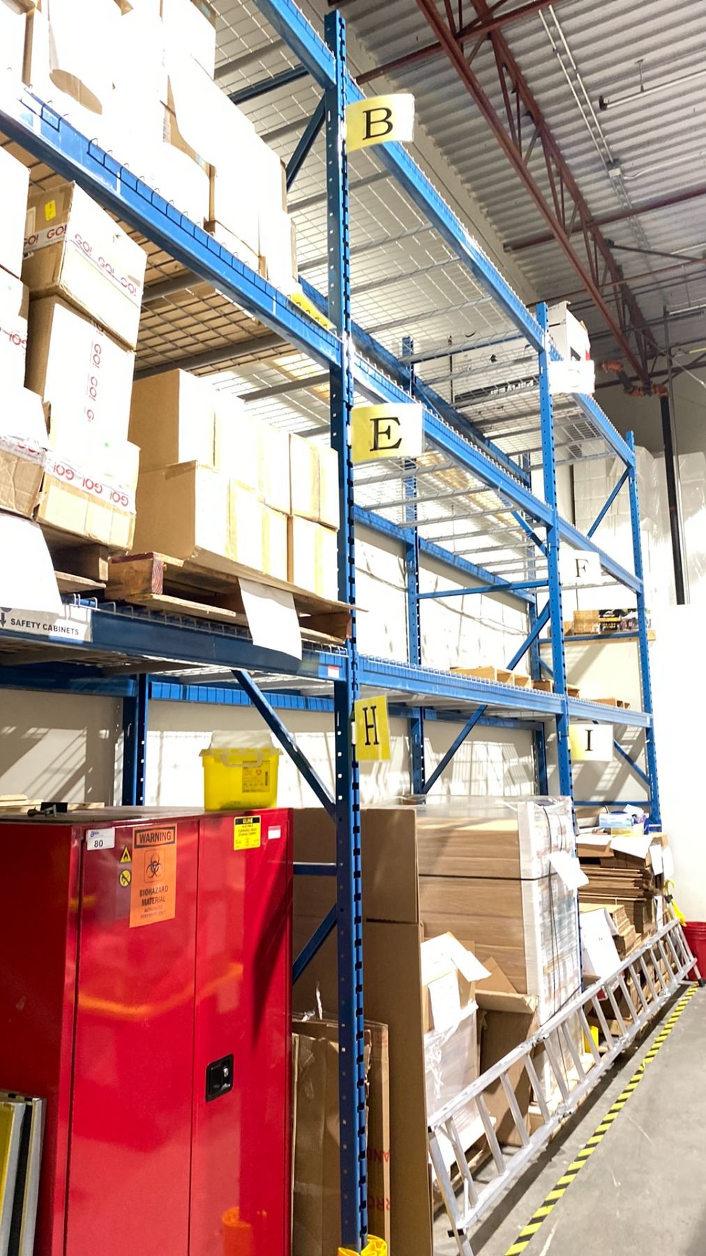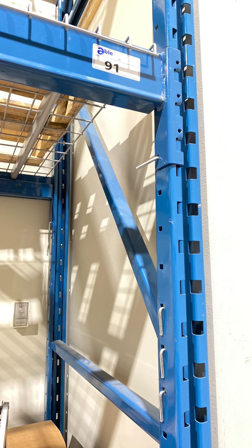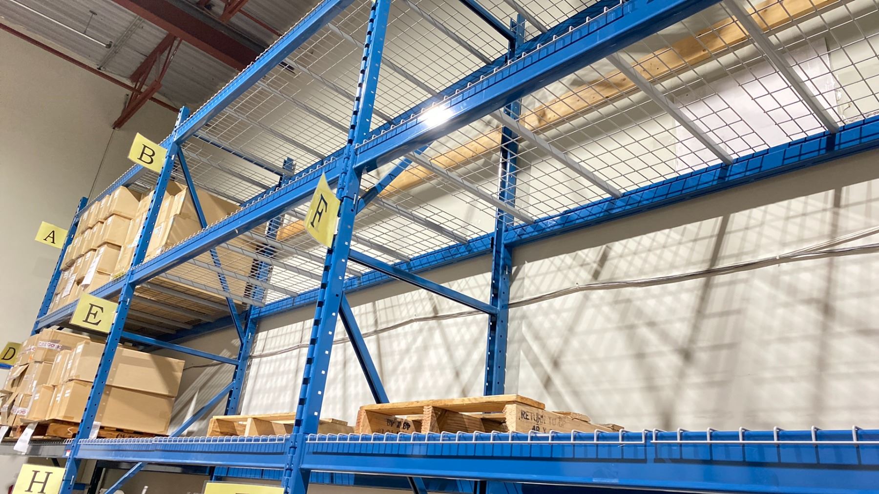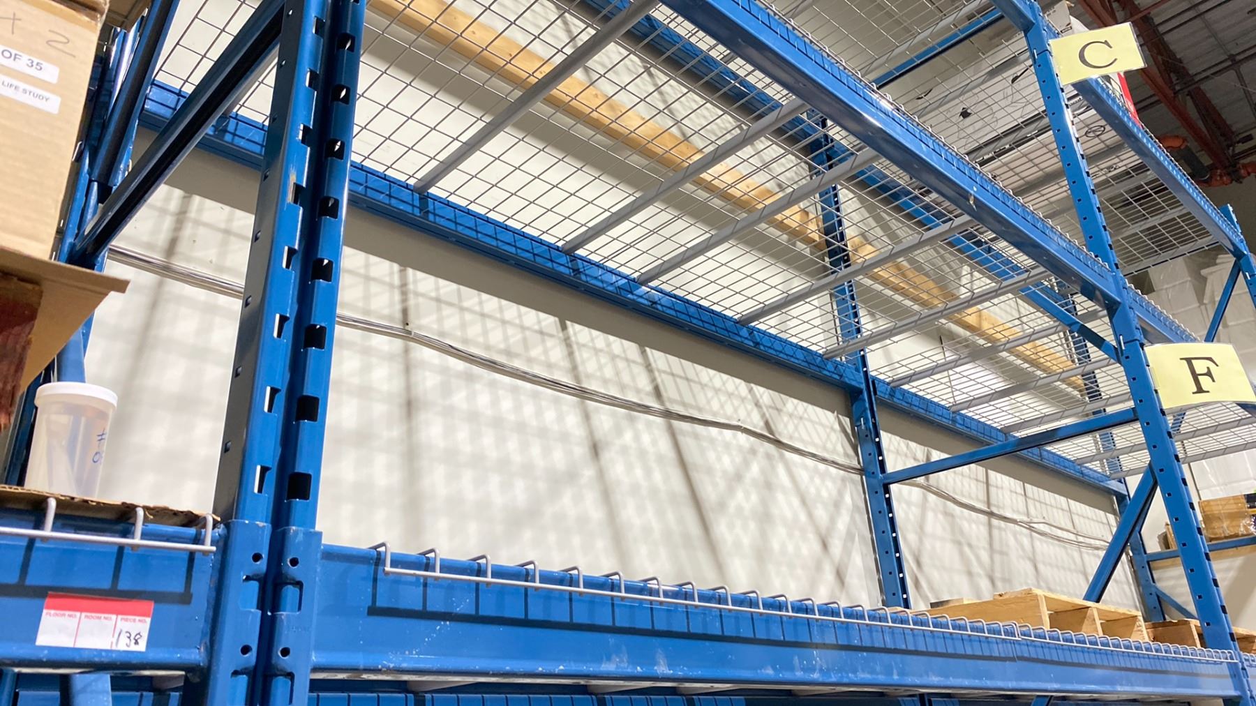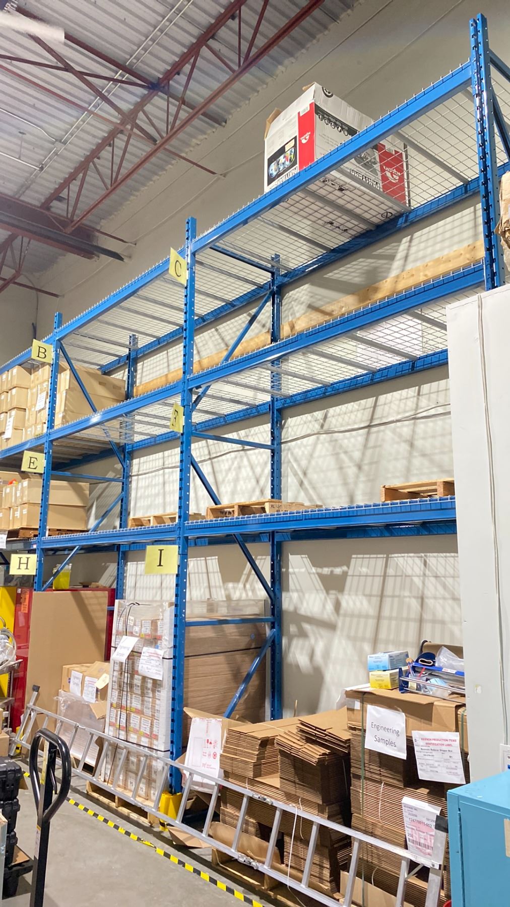 *LD* 3 BAYS PALLET RACKING BLUE 16' HIGH PER BAY 4 UPRIGHTS WITH 18 SIDE RAILS WITH MESH DECKING APPROX 27' TOTAL LENGTH (CONTENTS NOT INCLUDED) *LAST DAY PICKUP FIRST THING FRIDAY*