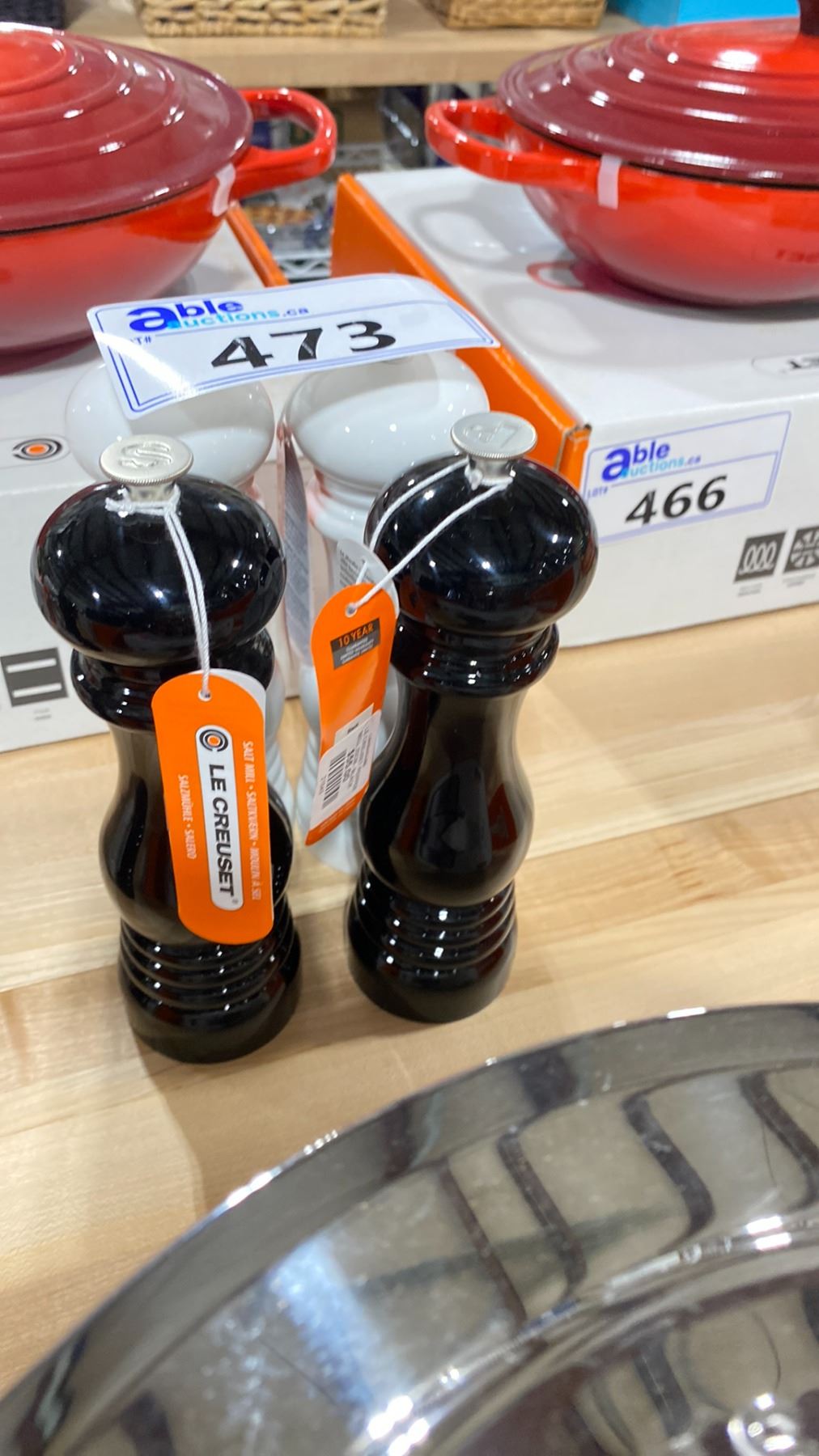 LE CREUSET PAIR OF BLACK AND WHITE SALT AND PEPPER SHAKERS