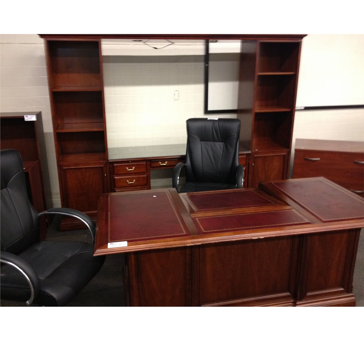 LEATHER INLAYED TRADITIONAL DESK WITH MATCHING WALL UNIT