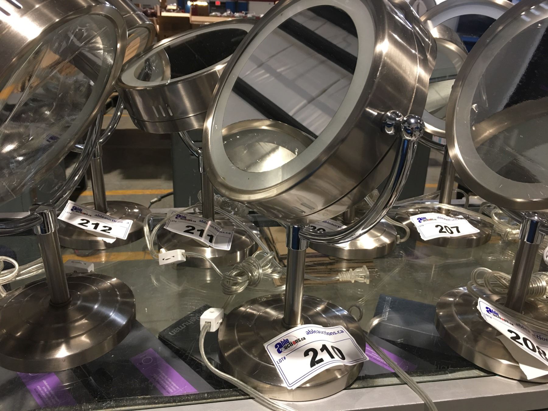 LED VANITY MIRROR WITH STANDARD MIRROR AND MAGNIFICATION SIDE MIRRORS ARE APPROX 8" DIAMETER AND UNIT STANDS APPROX 15" TALL