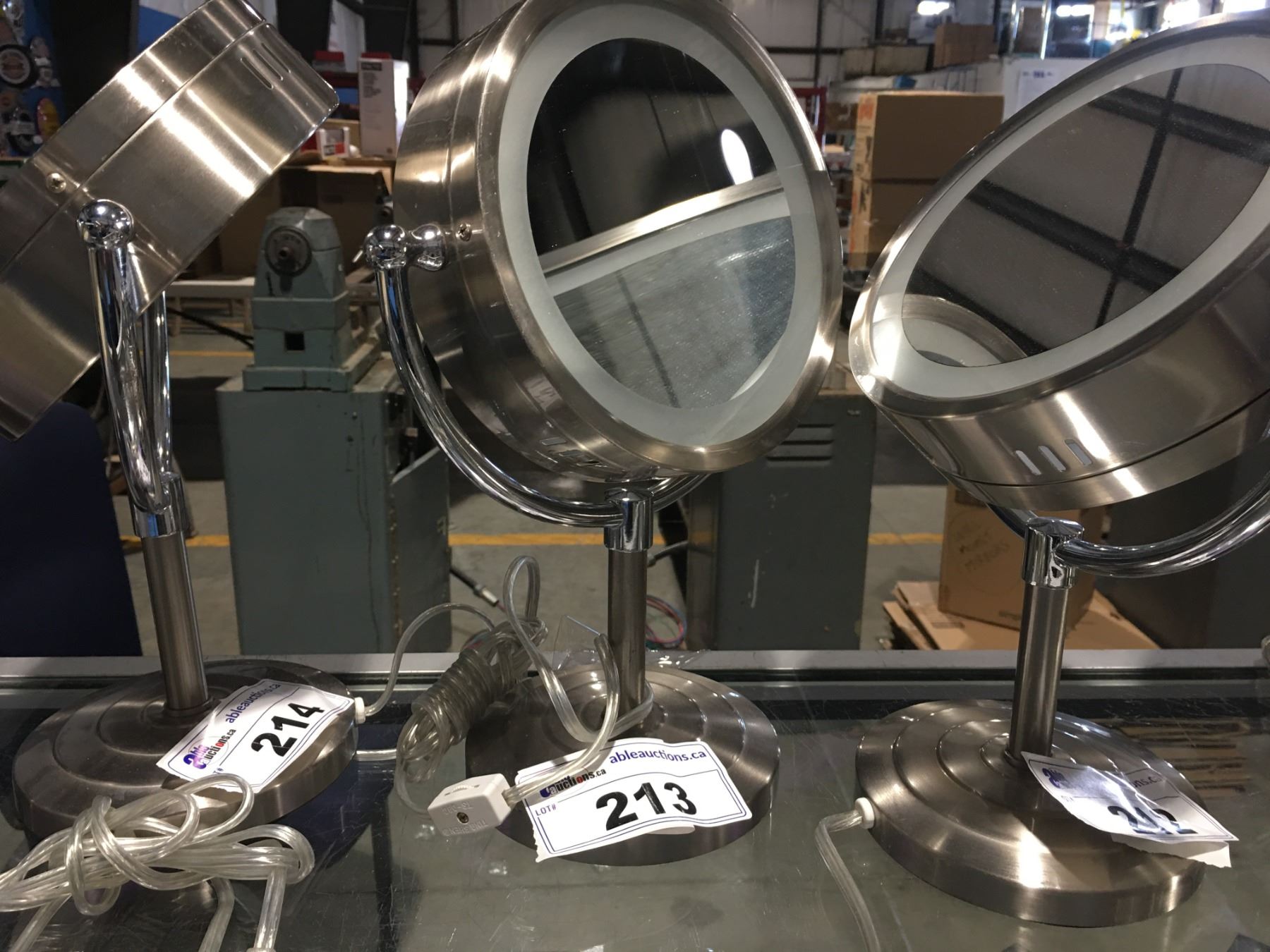 LED VANITY MIRROR WITH STANDARD MIRROR AND MAGNIFICATION SIDE MIRRORS ARE APPROX 8" DIAMETER AND UNIT STANDS APPROX 15" TALL