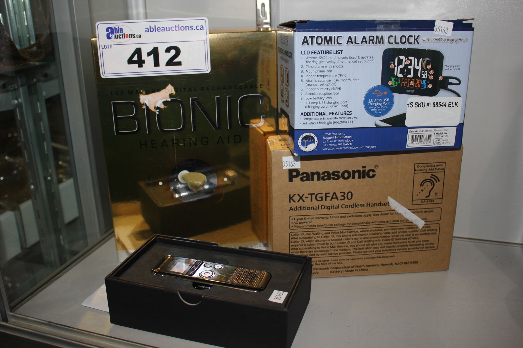 LEE MAJORS DIGITAL RECHARGEABLE BIONIC HEARING AID, ATOMIC ALARM CLOCK, PANASONIC KX-TGFA30 HEARING AID T-COIL, & OCHO Q-10 RECORDER