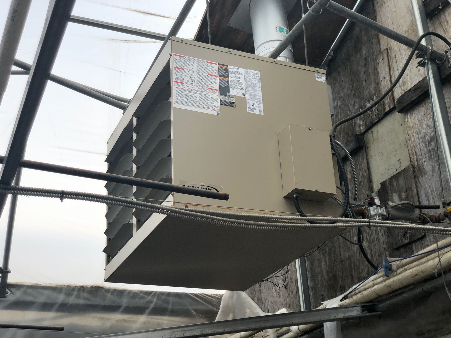 LENNOX MODEL LF24-400A-5 DUAL FAN GAS POWERED HEAT UNIT, COMES WITH PIPING TO FIRST JOINT, 120 VOLT, SINGLE PHASE