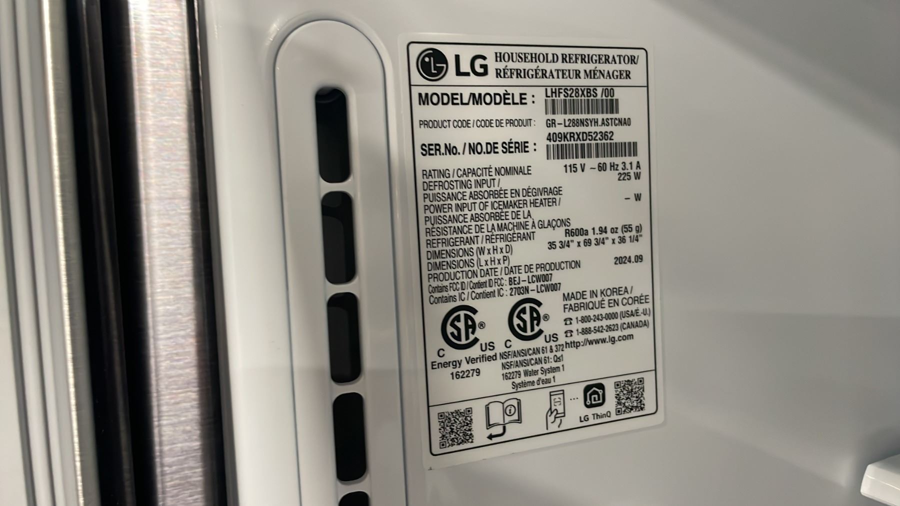 LG MODEL LHFS28XBS. 36" STAINLESS STEEL FRENCH DOOR BOTTOM FREEZER REFRIGERATOR WITH WATER & ICE DISPENSER SN 409KRXD52362 RETAIL PRICE $2,599.00