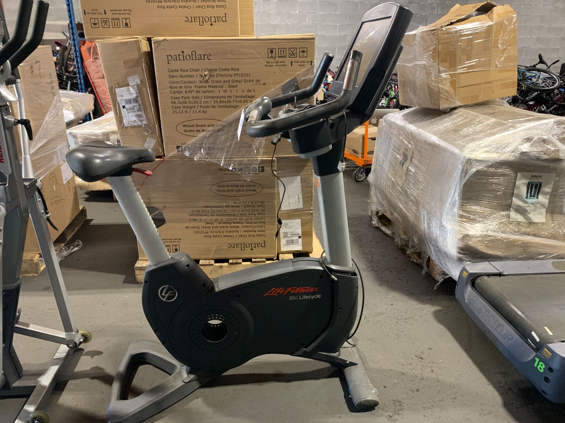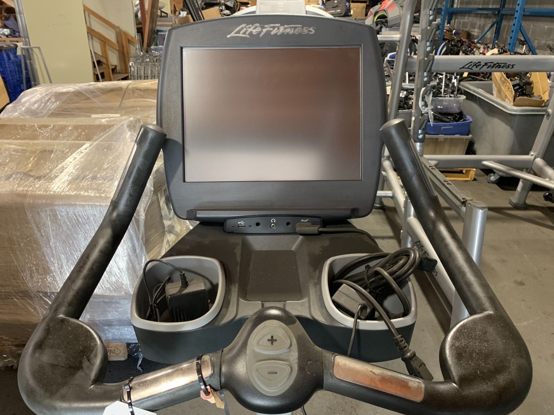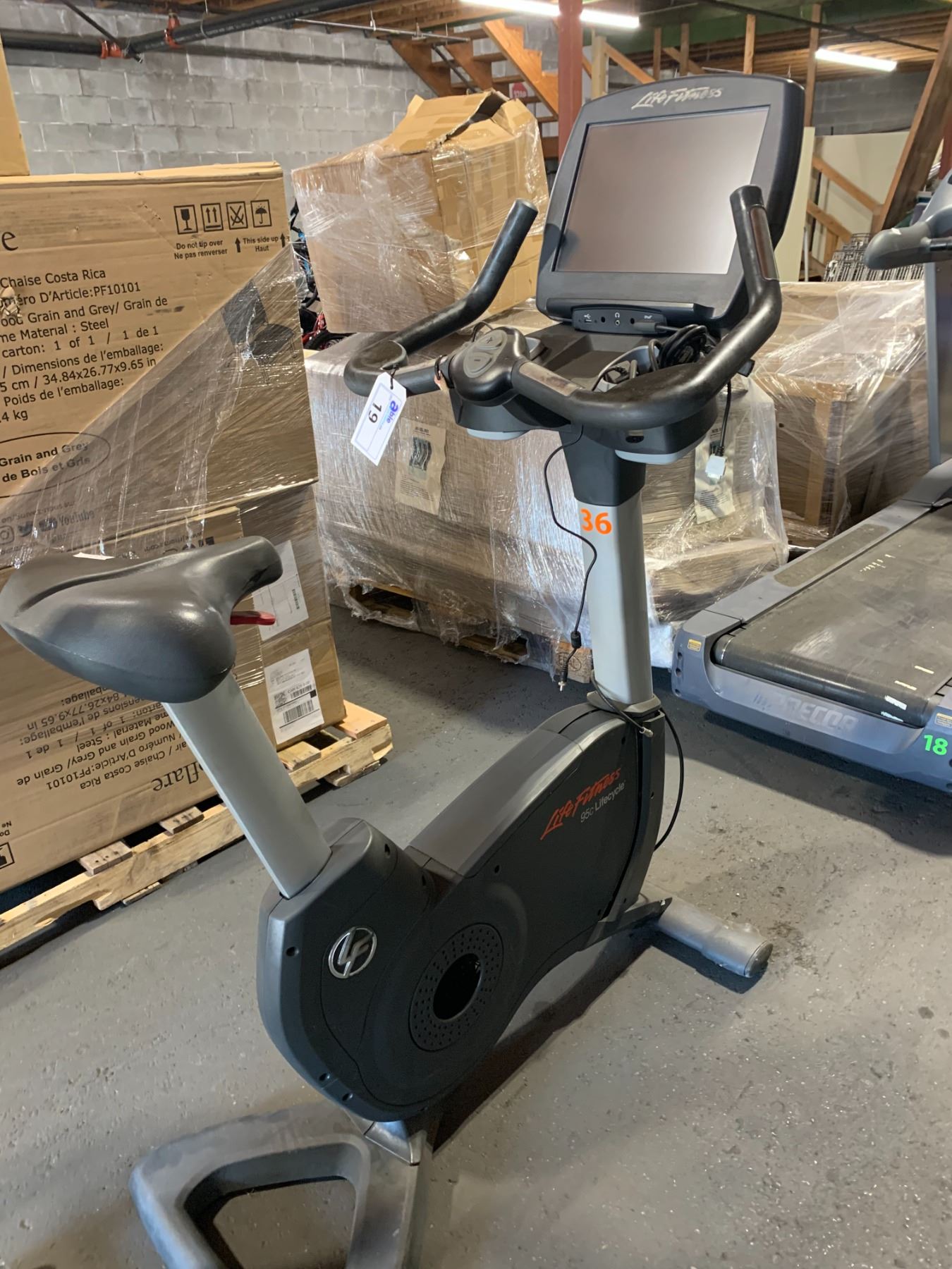 LIFE FITNESS 95C LIFECYCLE UPRIGHT COMMERCIAL EXERCISE BIKE WITH TOUCHSCREEN DISPLAY, HEAD PHONE JACK & USB INPUT ( HAS POWER ADAPTOR, NO PEDALS / CRANK NEEDS REPAIR )