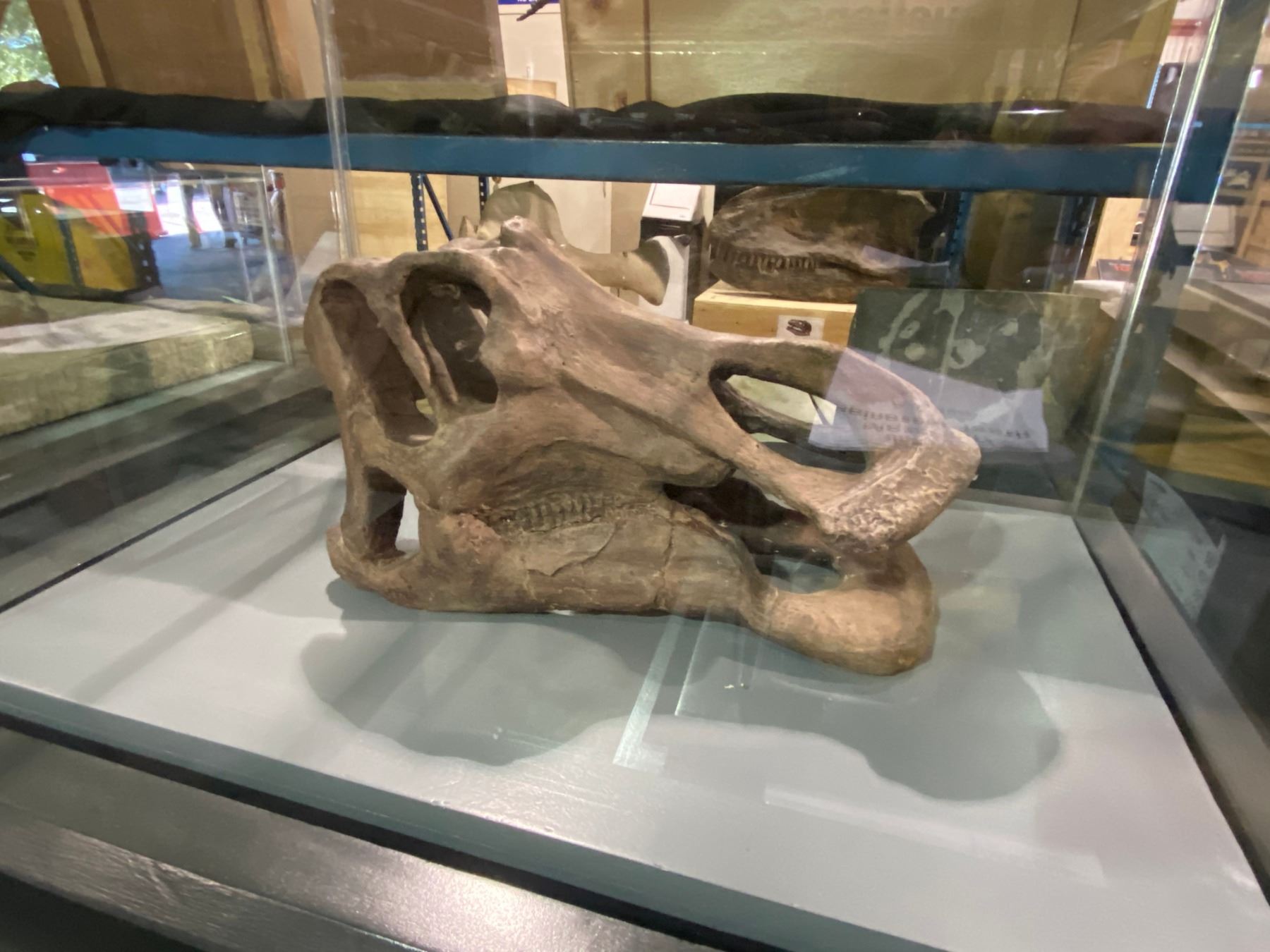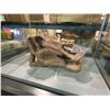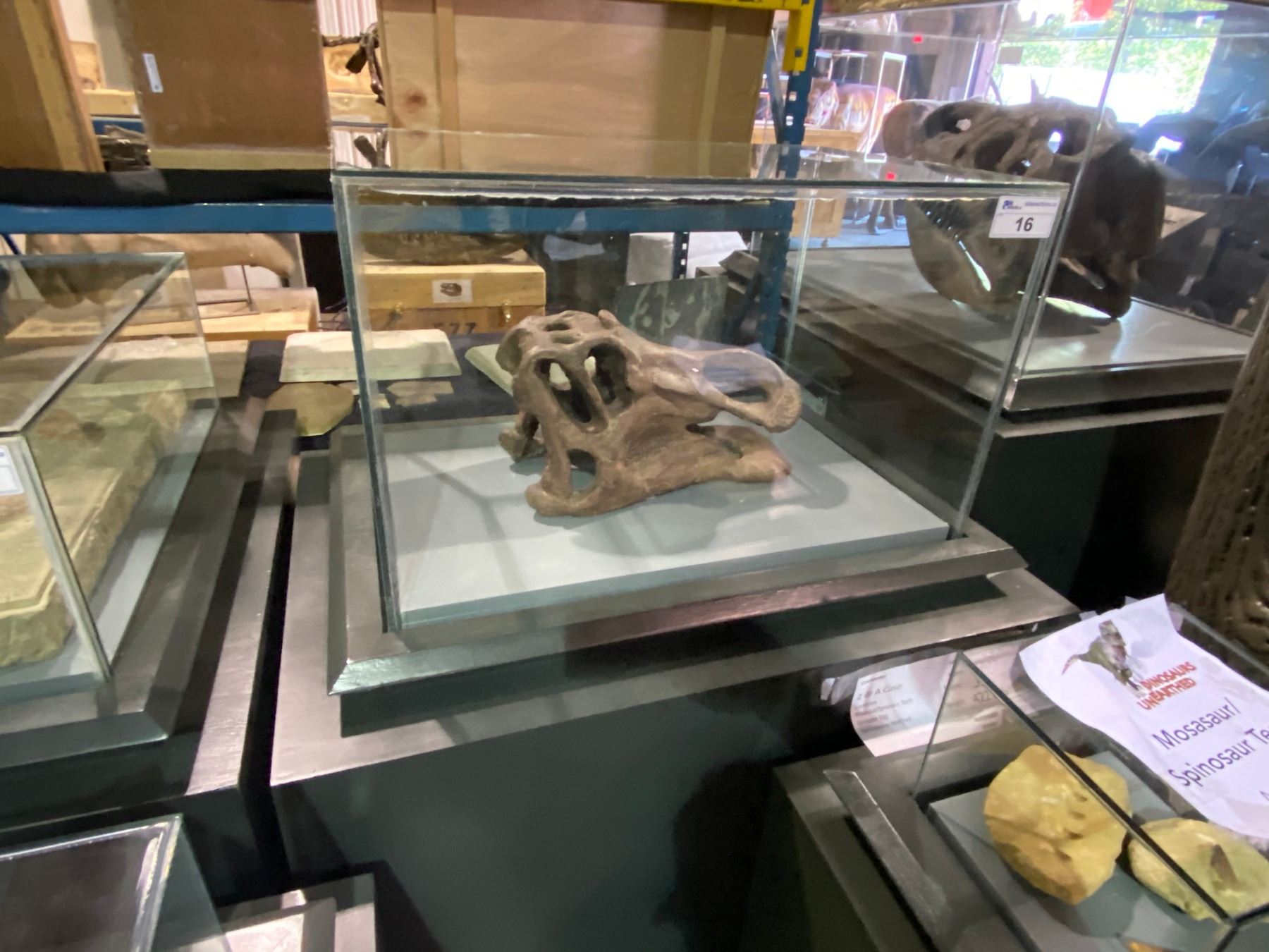 LIFE SIZE HADROSAUR SKULL IN GLASS COVERED TRANSPORT DISPLAY CASE SKULL SIZE: 11"W X 20"L X 12"H DISPLAY SIZE ASSEMBLED: 34"W X 45"L X 52"H *REPRODUCTION* APPROX 340LBS