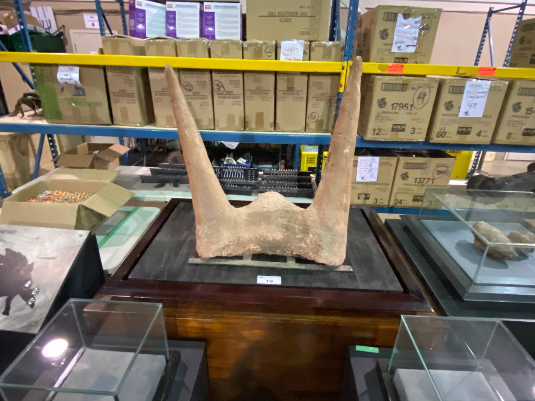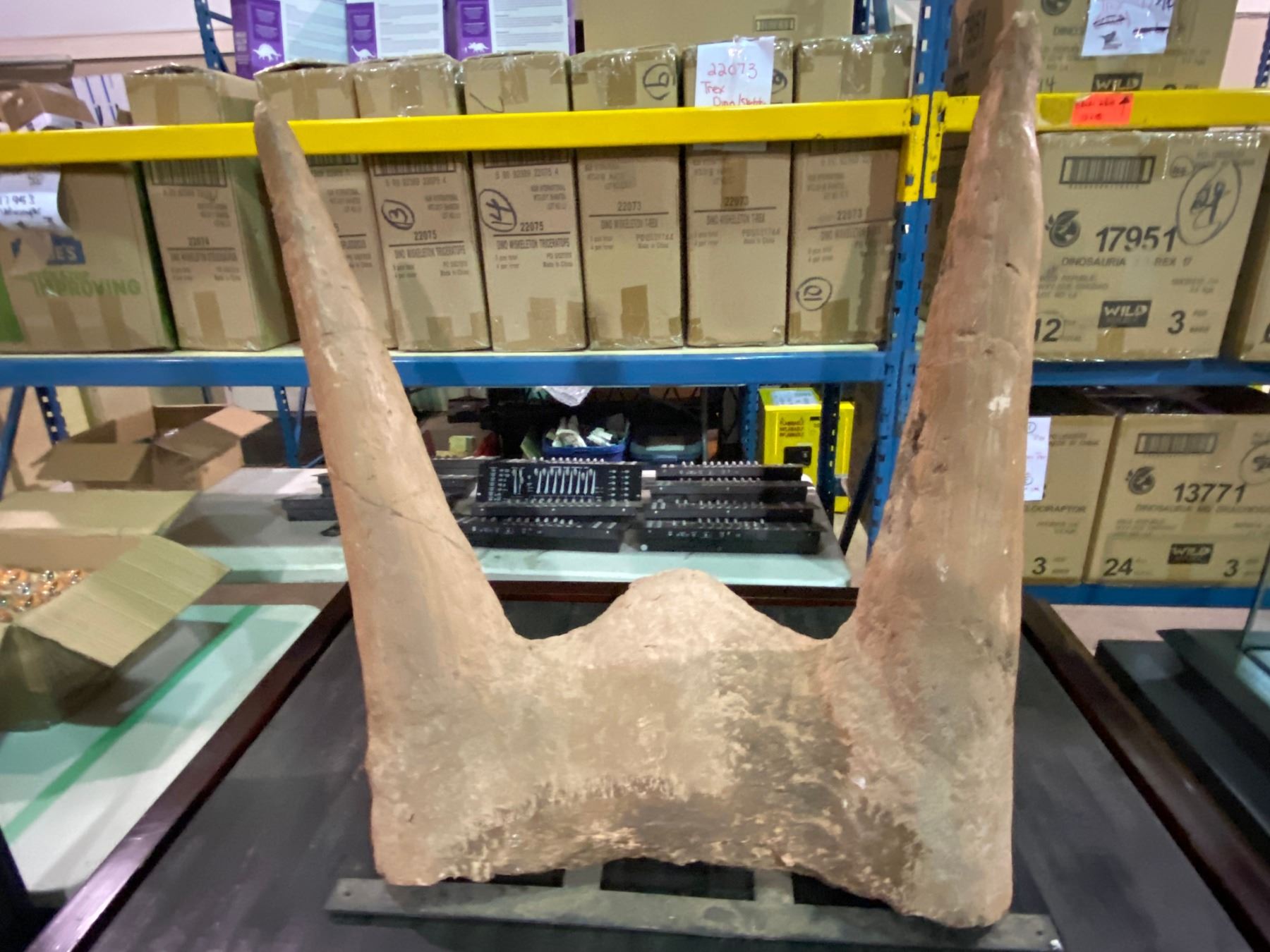 LIFE SIZE JUVENILE TRICERATOPS HORNS IN TRANSPORT DISPLAY CASE HORN SIZE: 16"D X 31"W X 35"H DISPLAY SIZE ASSEMBLED: 42"W X 57"L X 32"H *REPRODUCTION* APPROX 360LBS