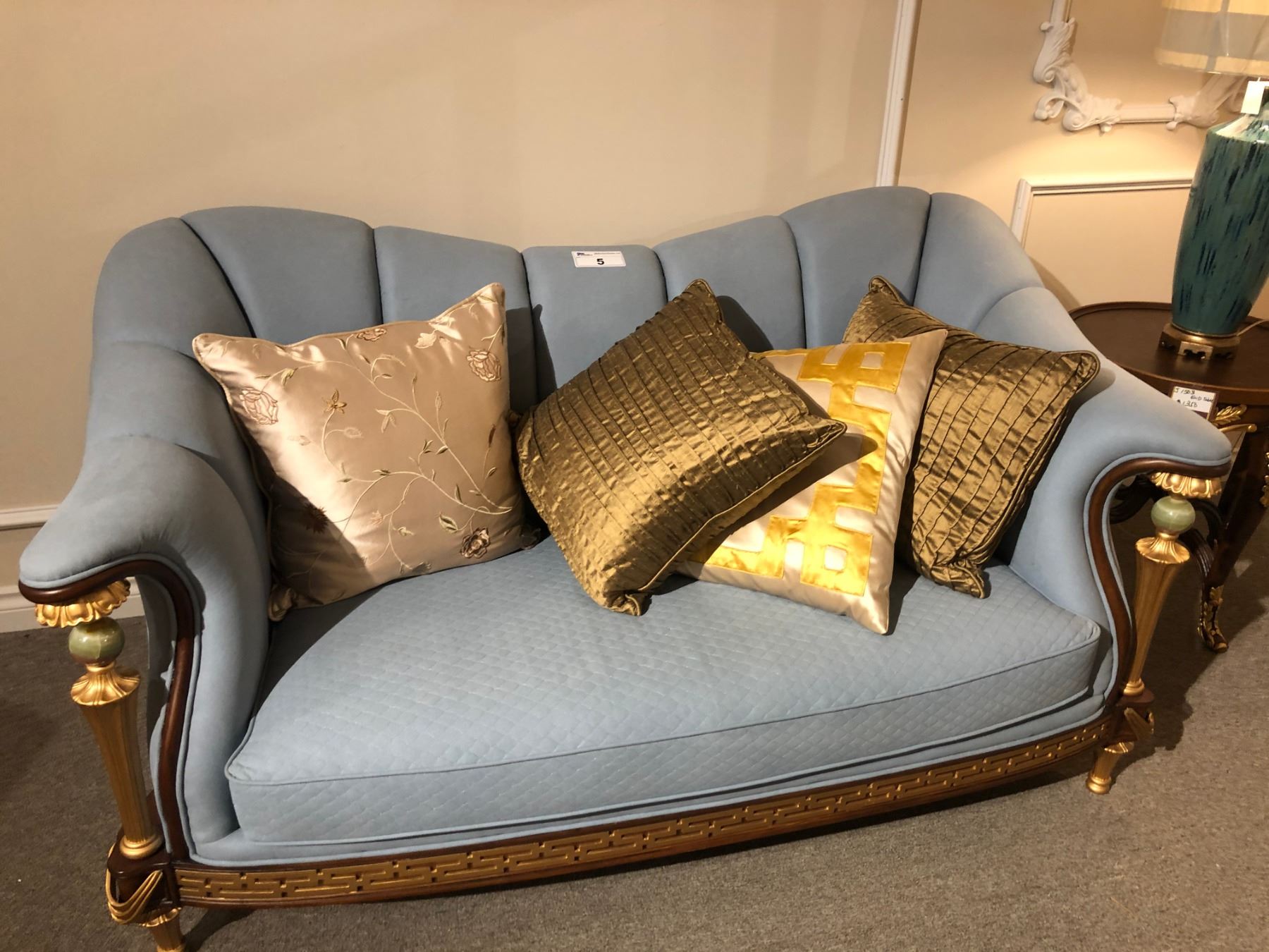 LIGHT BLUE TWO SEAT SOFA WITH WOOD TRIM AND ACCENTS, INC. THROW CUSHIONS