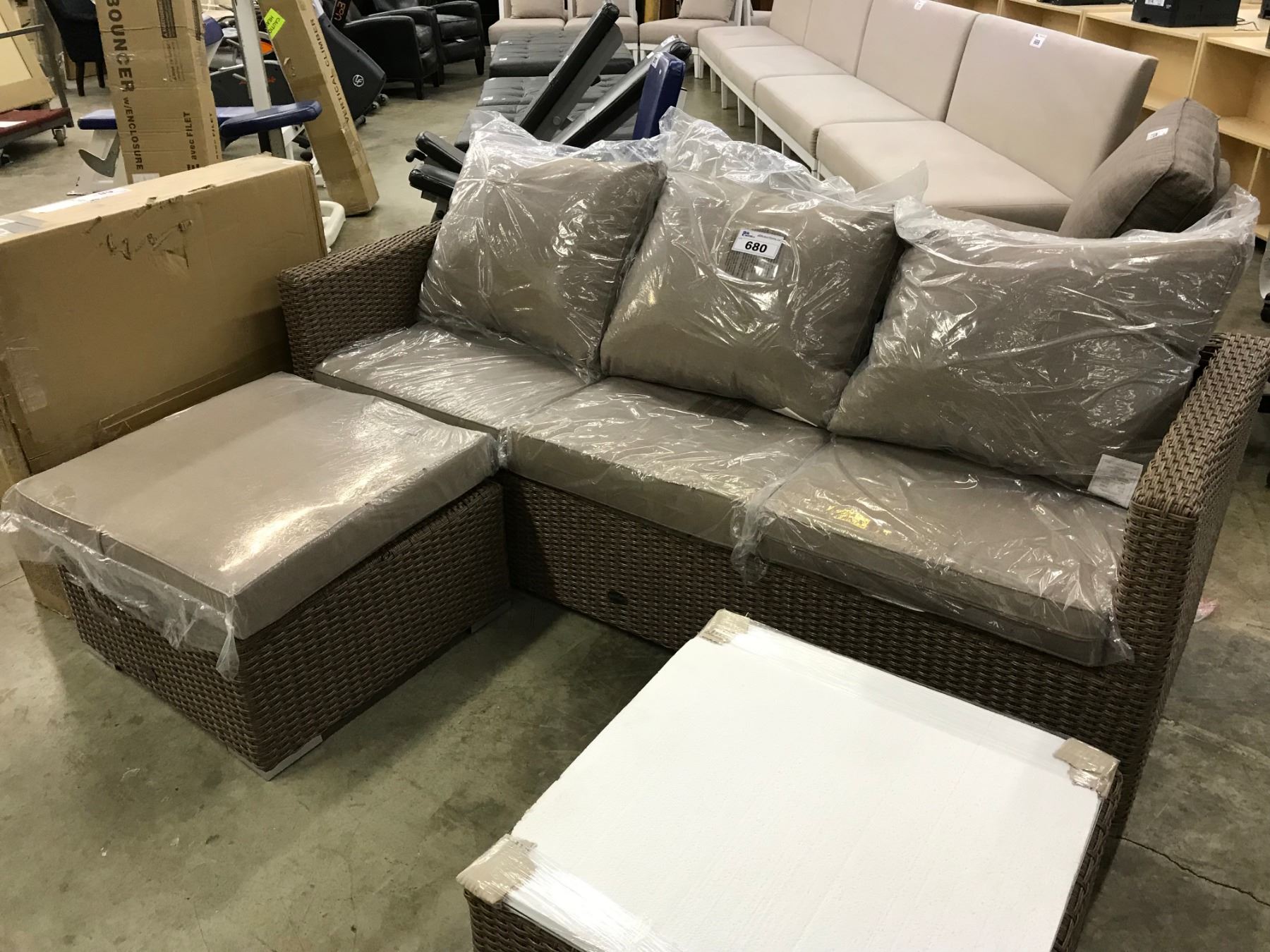 LIGHT BROWN 3 SEAT PATIO SET INCLUDING OTTOMAN AND GLASS TOP TABLE
