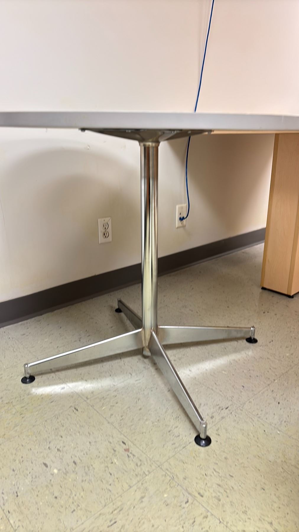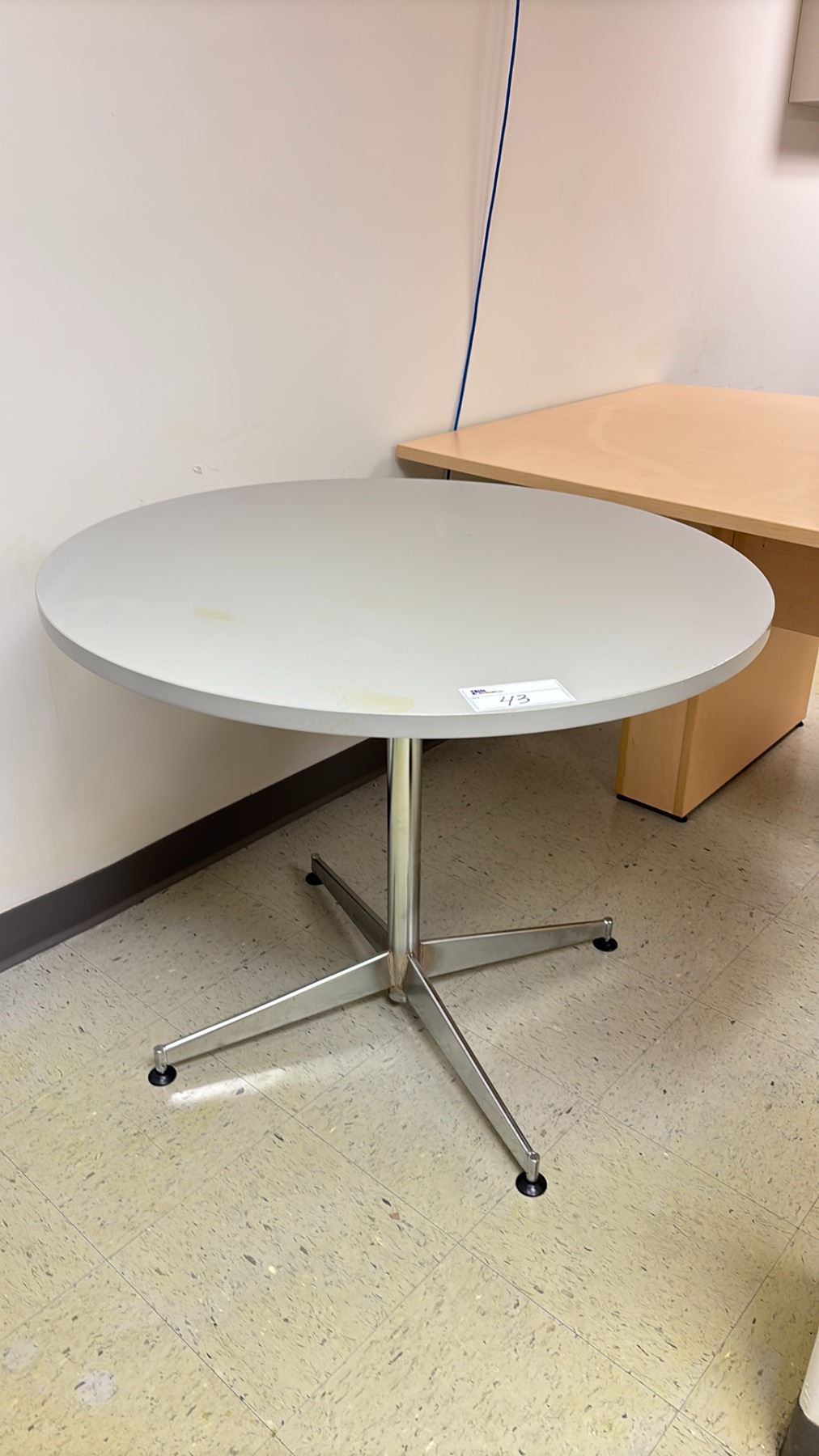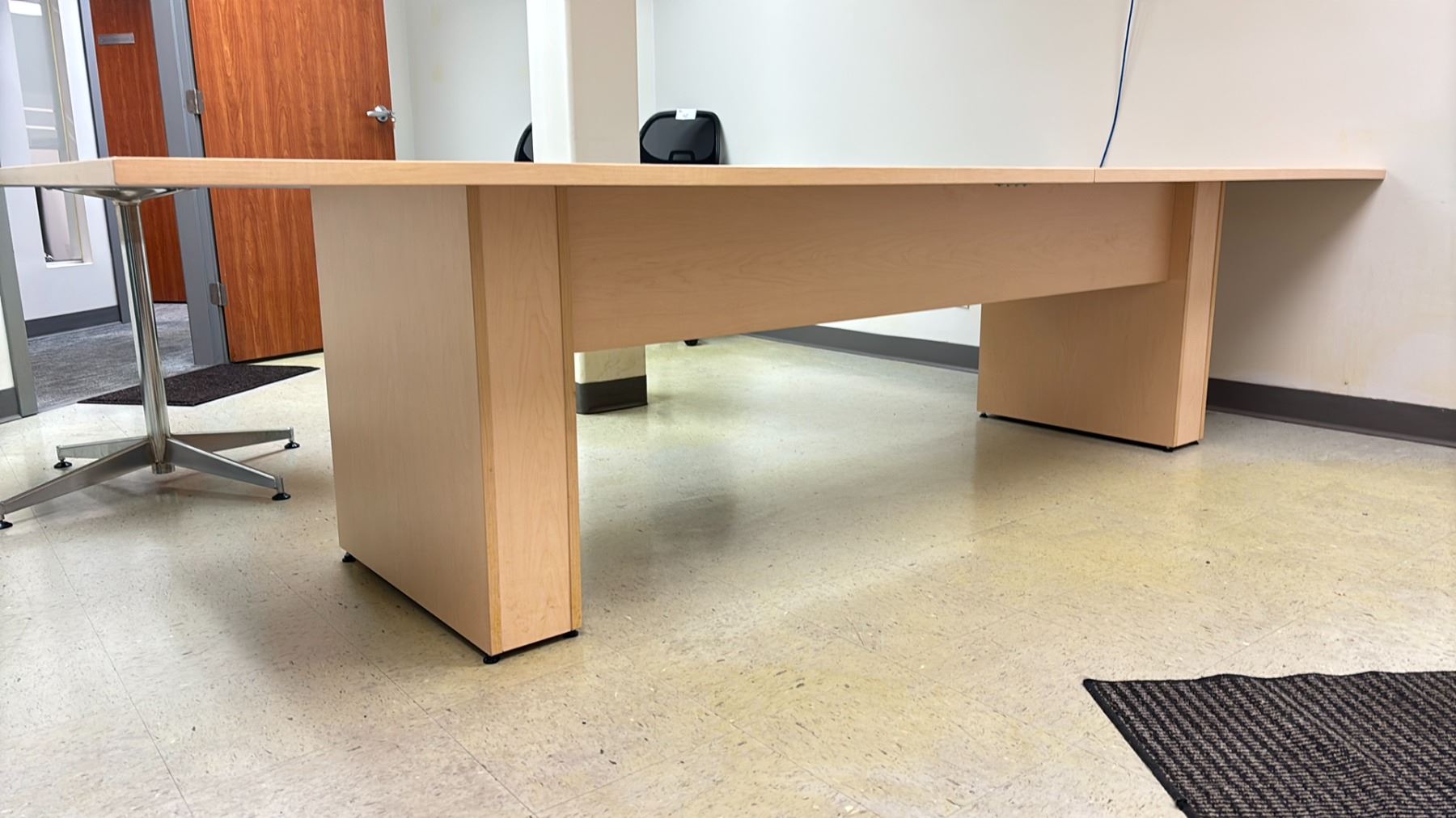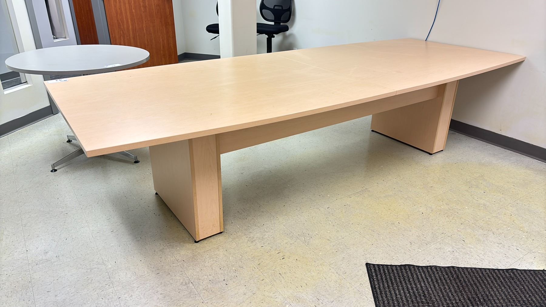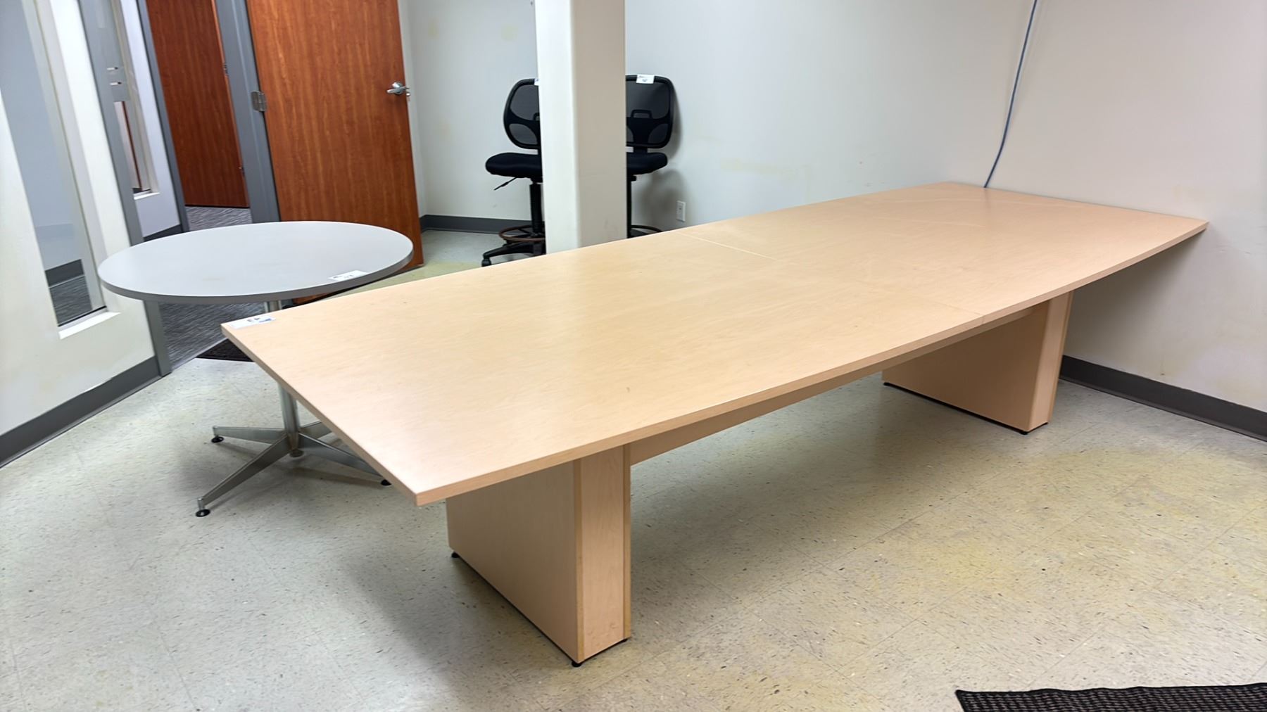 LIGHT WOODEN CURVED EDGE 120"W X 48"D X 30"H DINING TABLE & A ROUND WOODEN TOP 36" DIAMETER 30"H SIDE TABLE WITH METAL LEGS