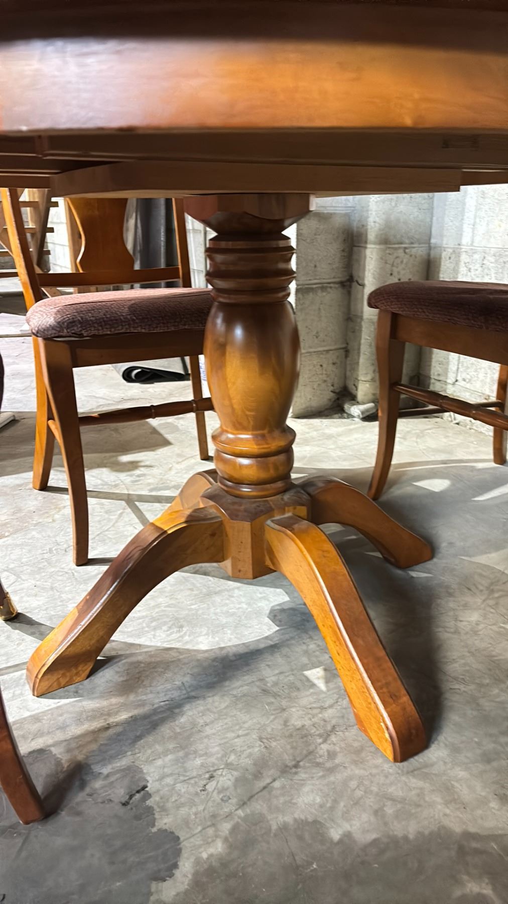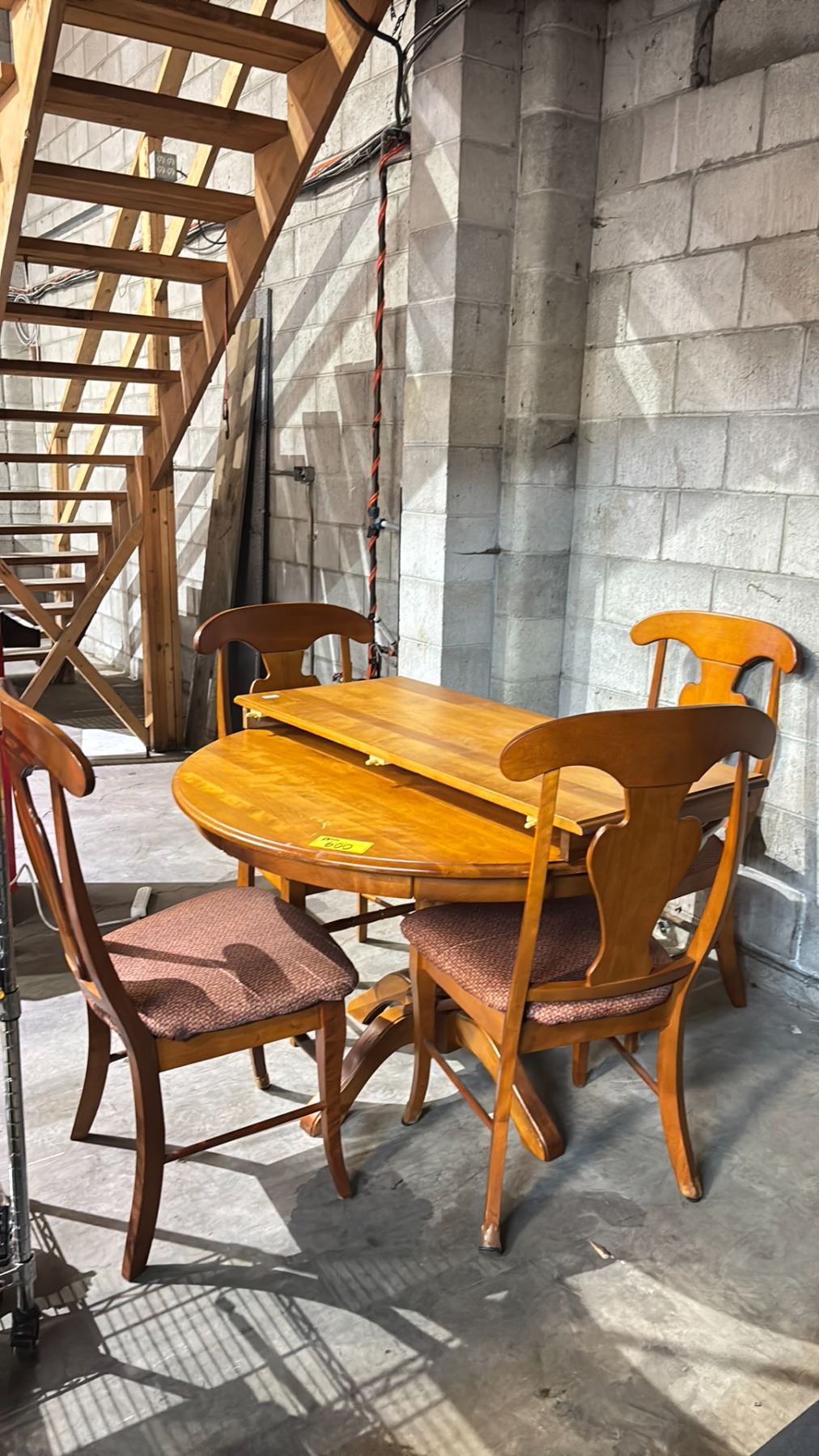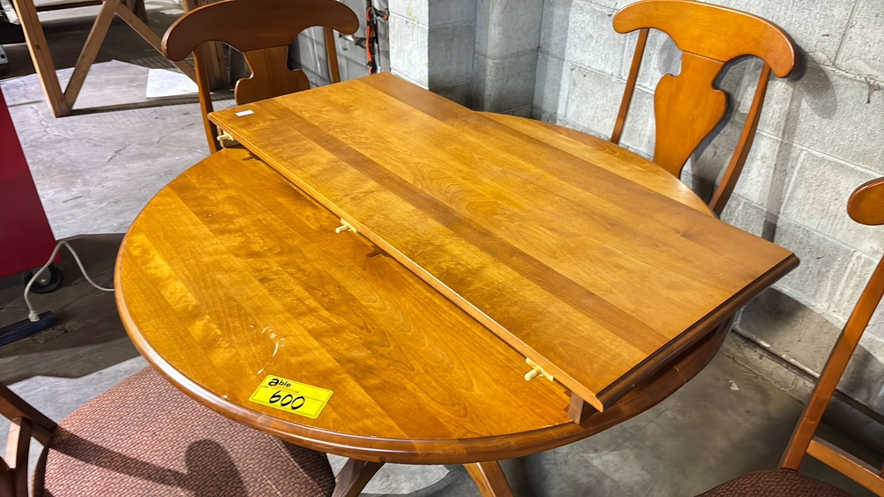 LIGHT WOODEN DINING TABLE WITH LEAF & 4 CHAIRS - 46" DIAMETER/ LEAF MEASURES 20"