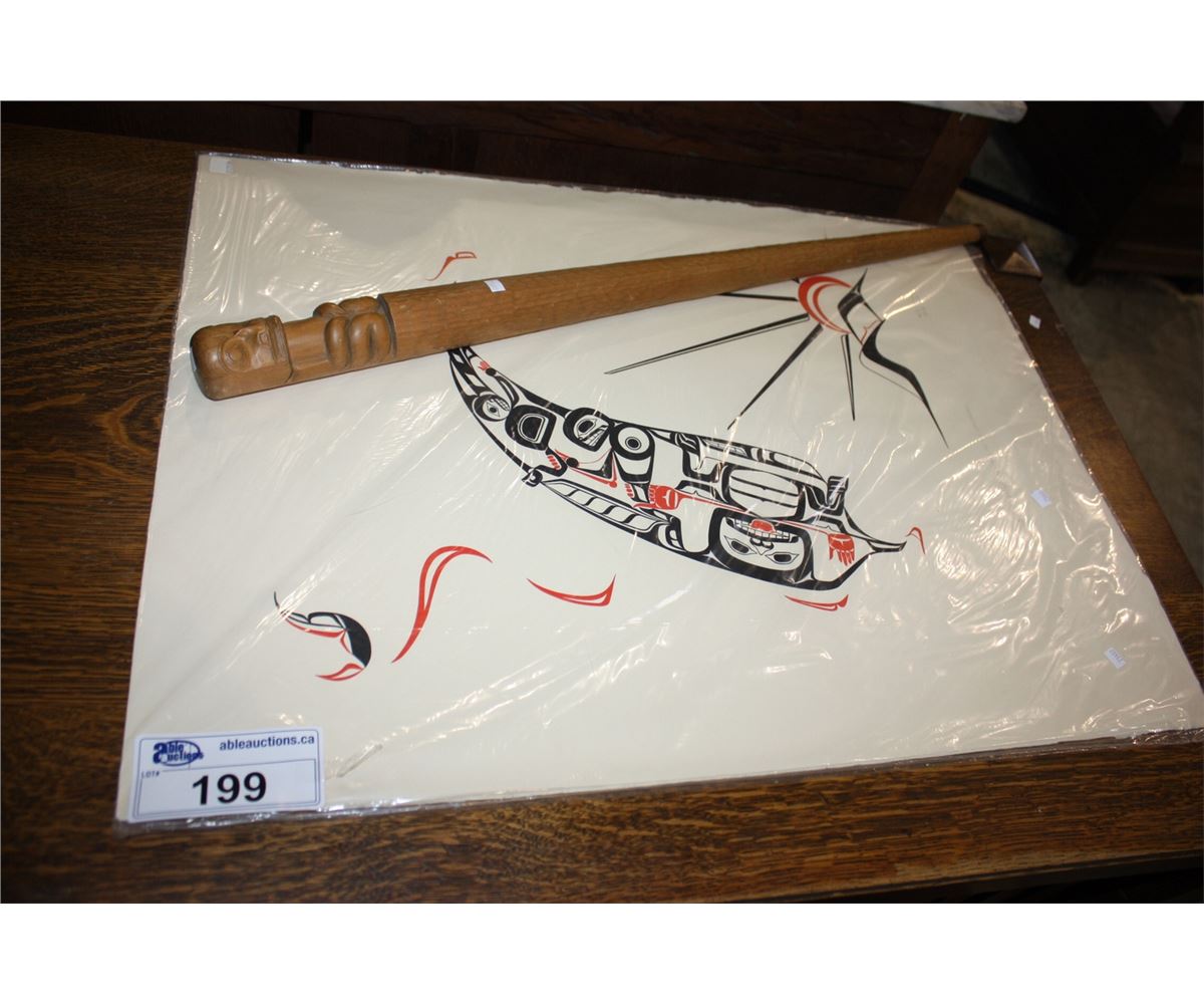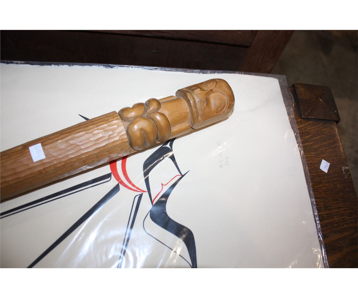 LIMITED EDITION WEST COAST NATIVE PRINT TITLED "THE MAGICAL FEATHER OF THE GITKSKN" BY ARTIST N J STERRITT 1978 # 9/100, COMES WITH CARVED NATIVE CEREMONIAL STICK