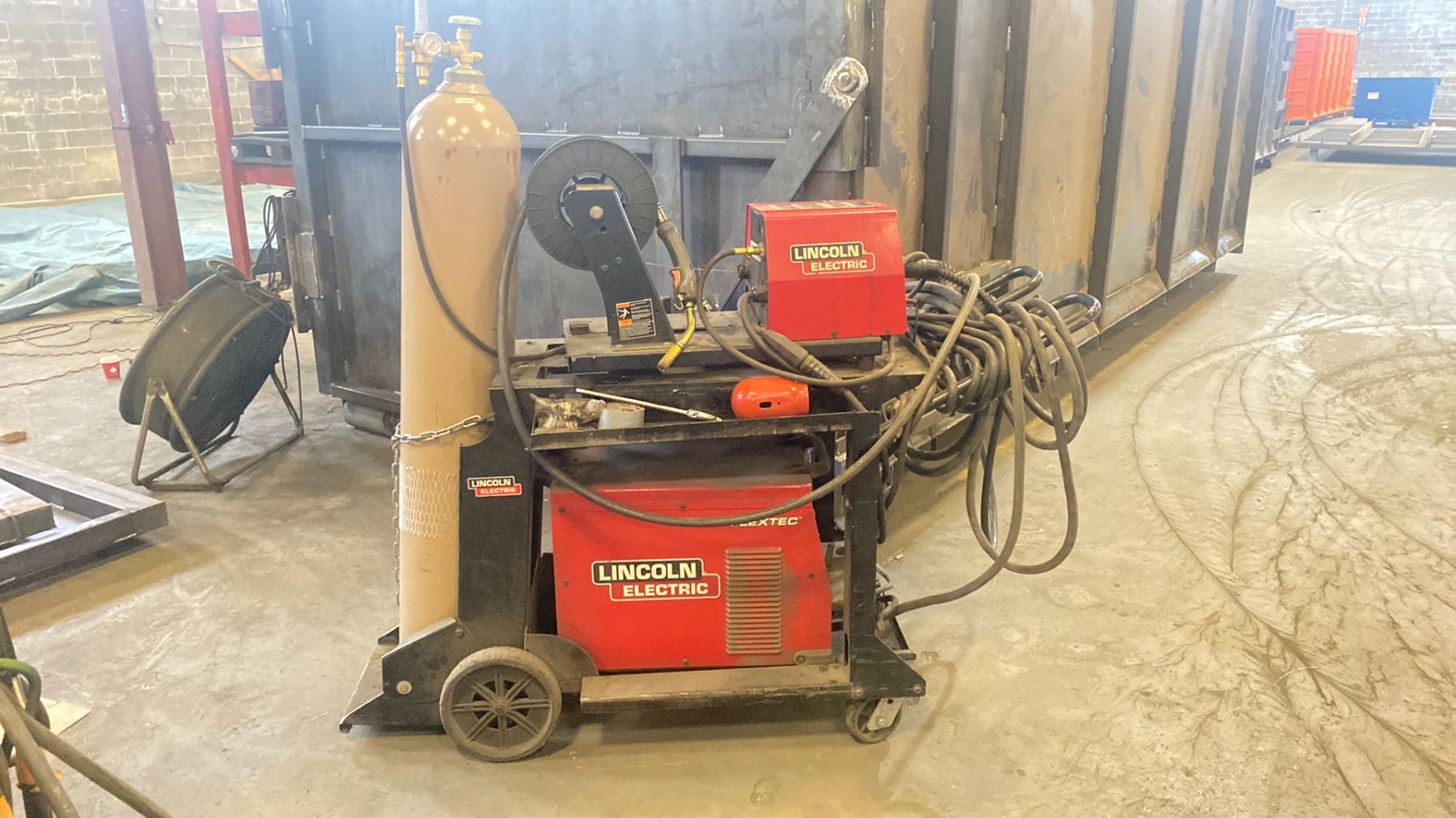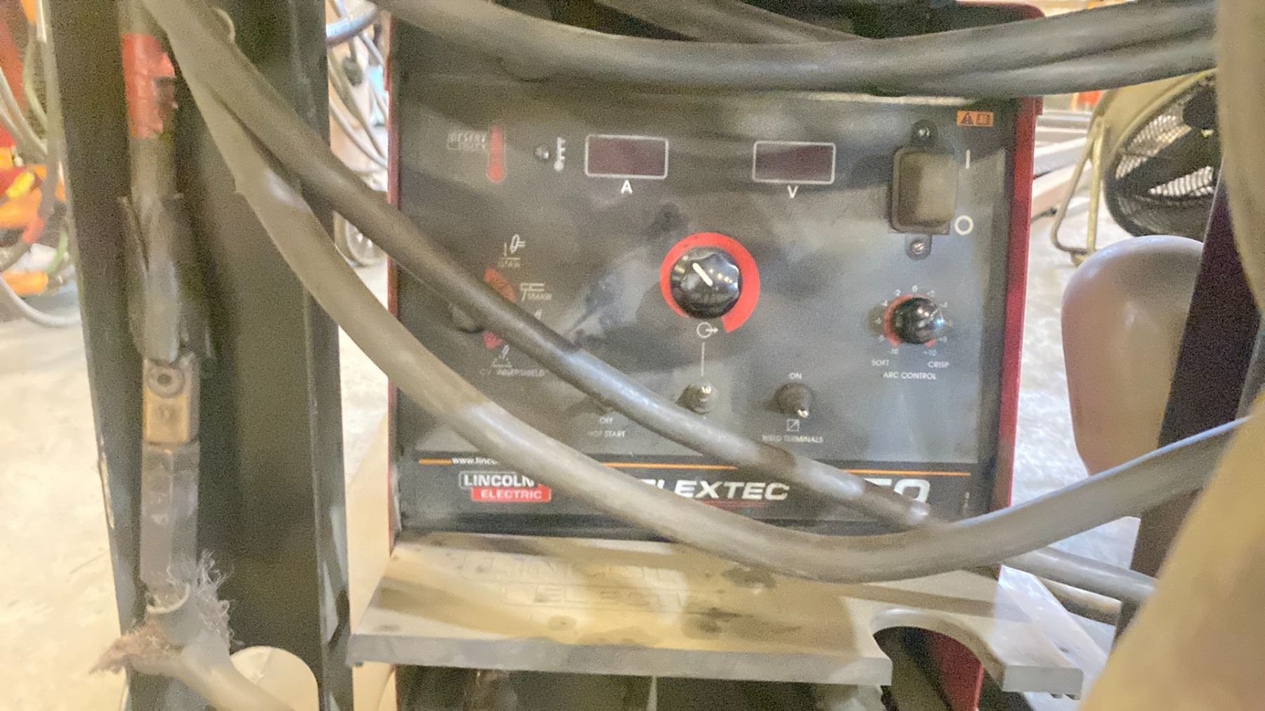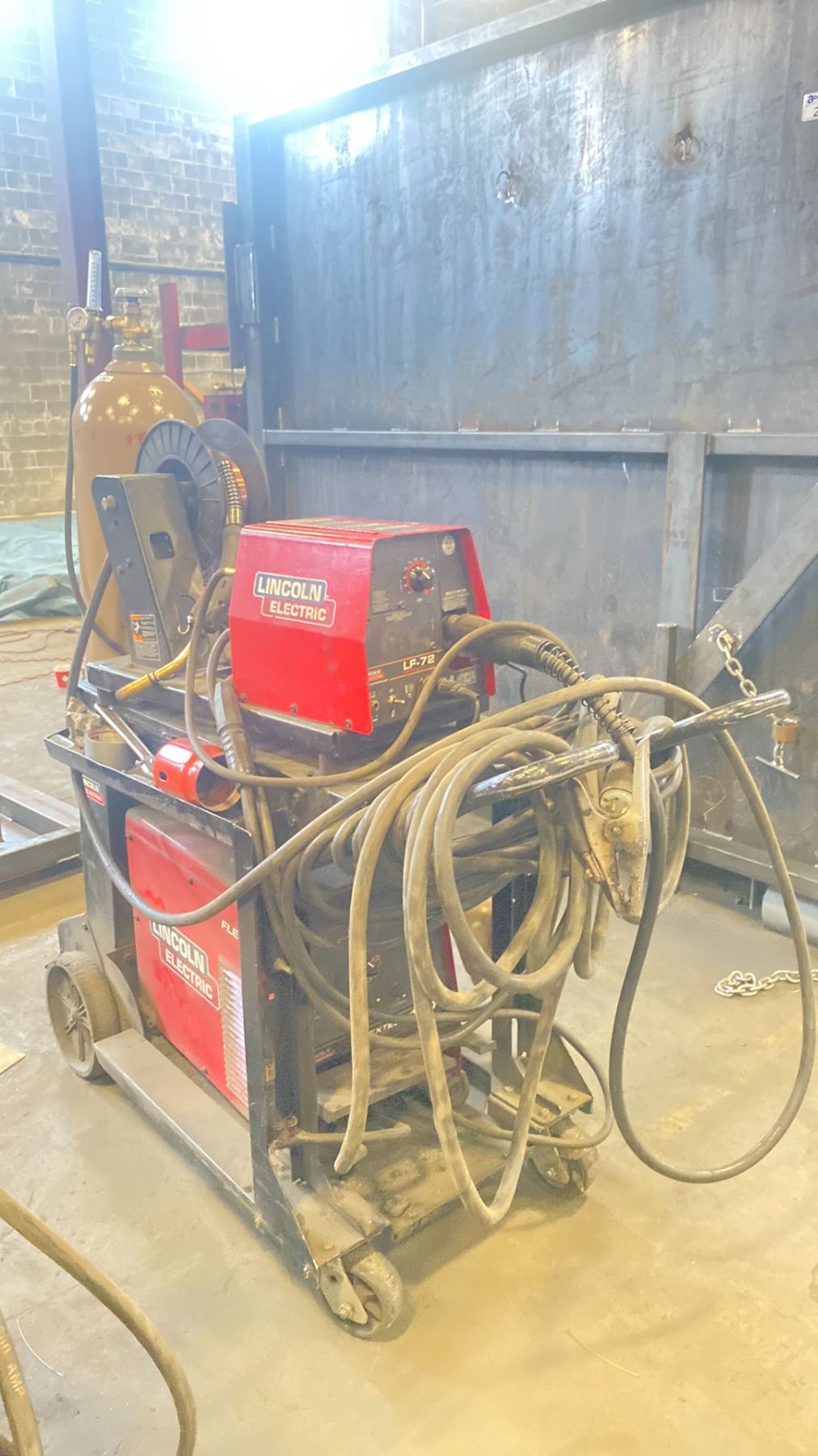 LINCOLN ELECTRIC FLEXTEC 450 WELDING MACHINE W/ LINCOLN ELECTRIC LF-72 WIRE FEED MIG WELDER WITH MOBILE WELDERS CART & TANK * TANK LEASED, CONTENTS ONLY *
