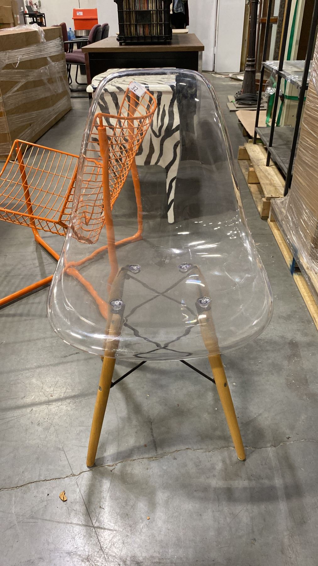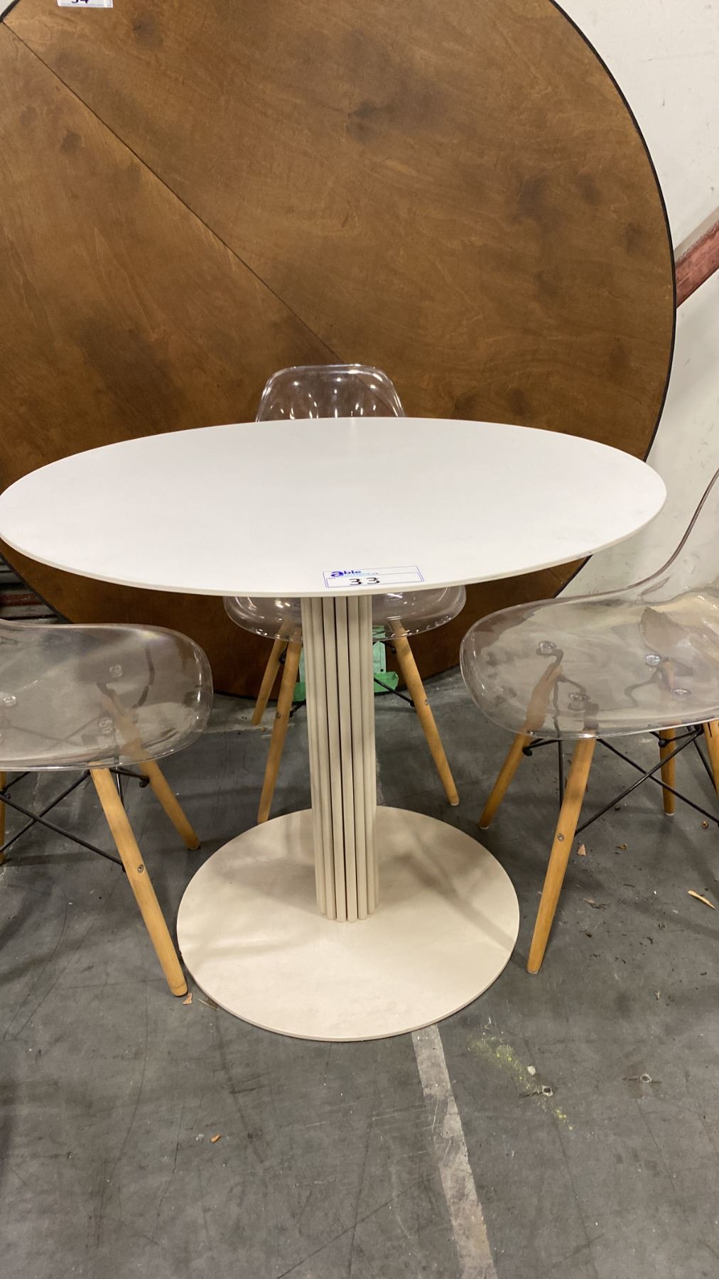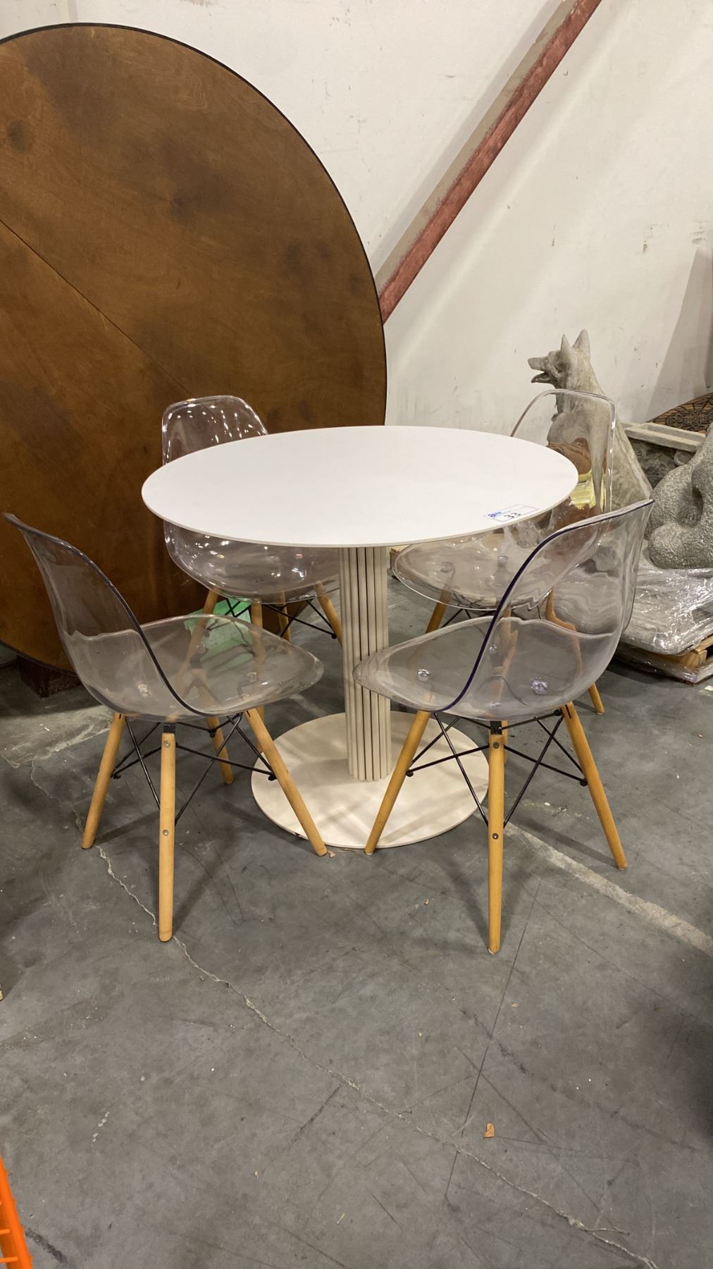 LINSY WHITE ROUND 30"H DINING TABLE & FOUR CLEAR/WOODEN LEG DINING CHAIRS