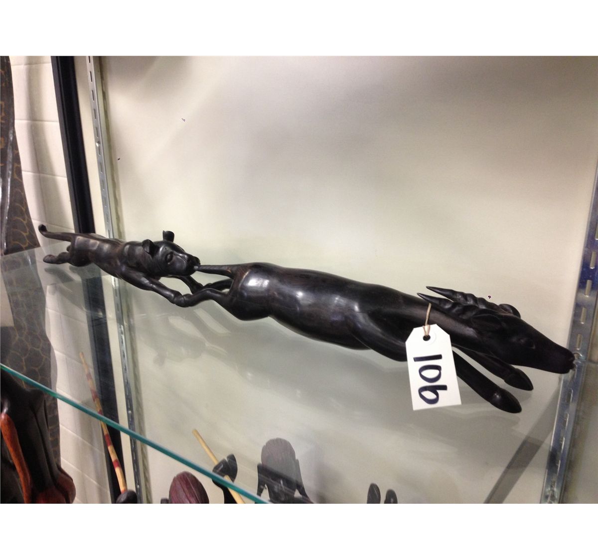 LION AND GAZELLE, HAND CARVED EBONY, 4" TALL 27" LONG