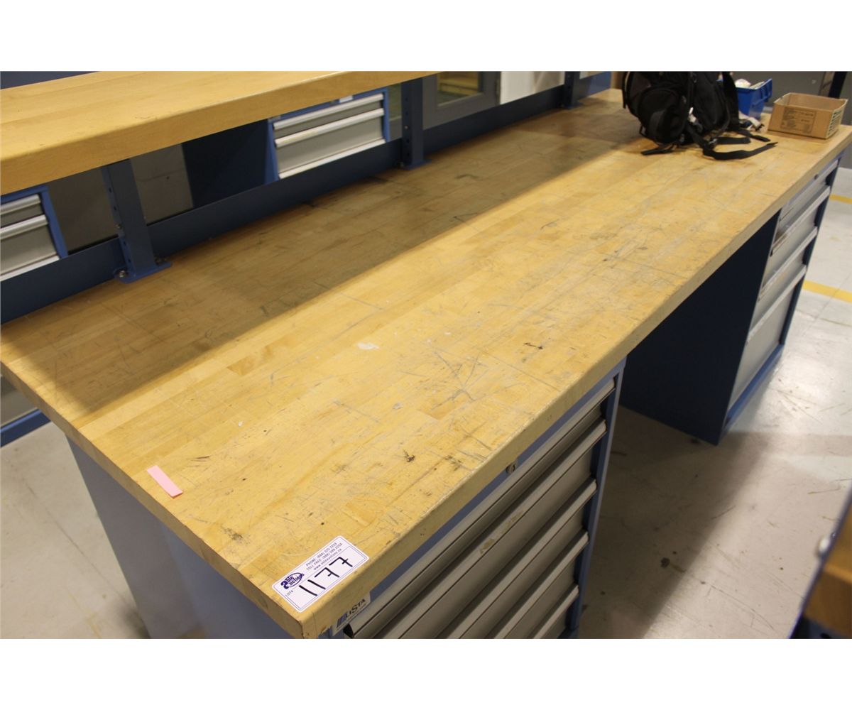 LISTA 3' X 8' SHOP BENCH WITH 5 DRW. AND 4 DRW PARTS / TOOL CABINETS AND BENCH MOUNT SHELF