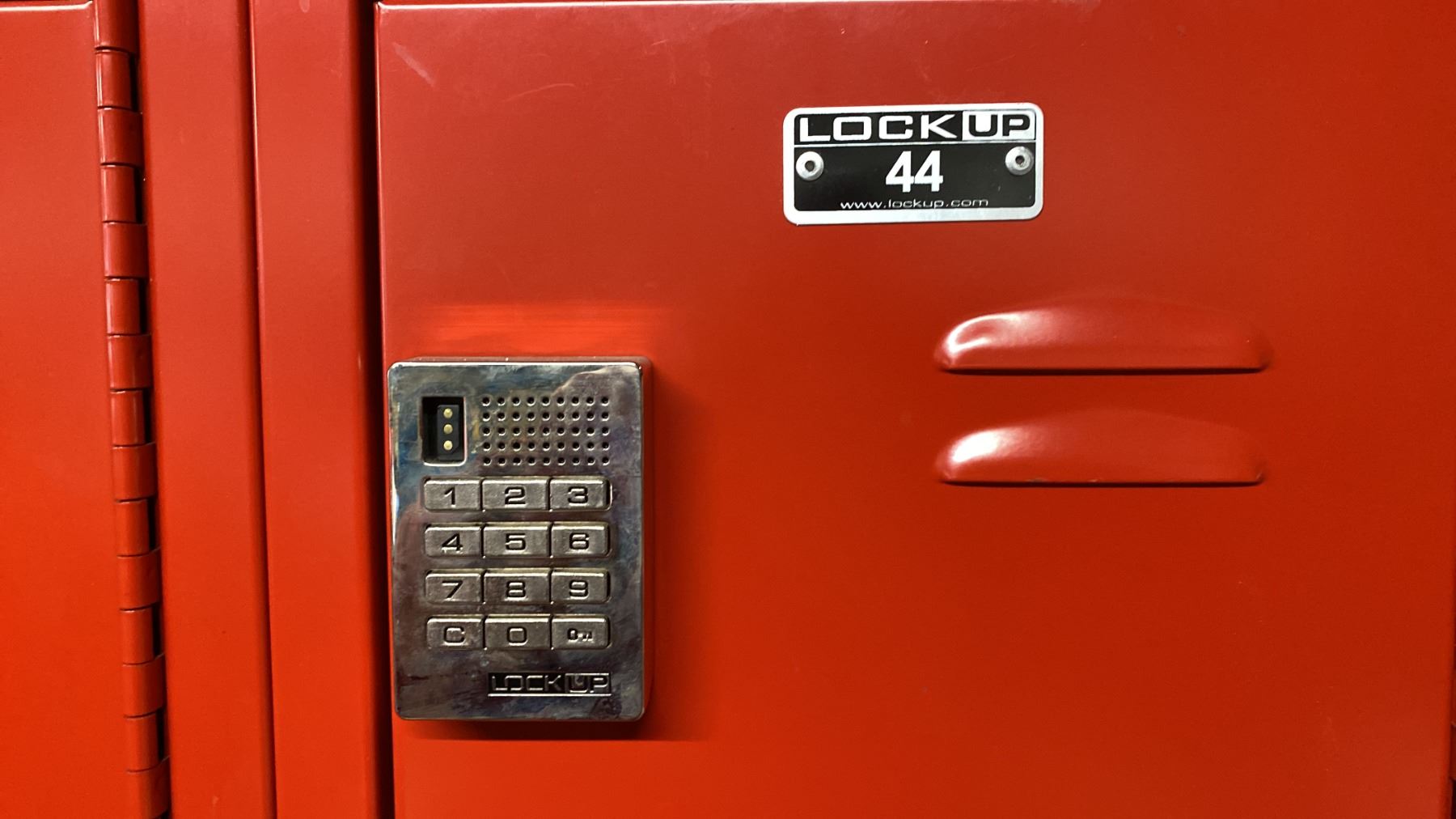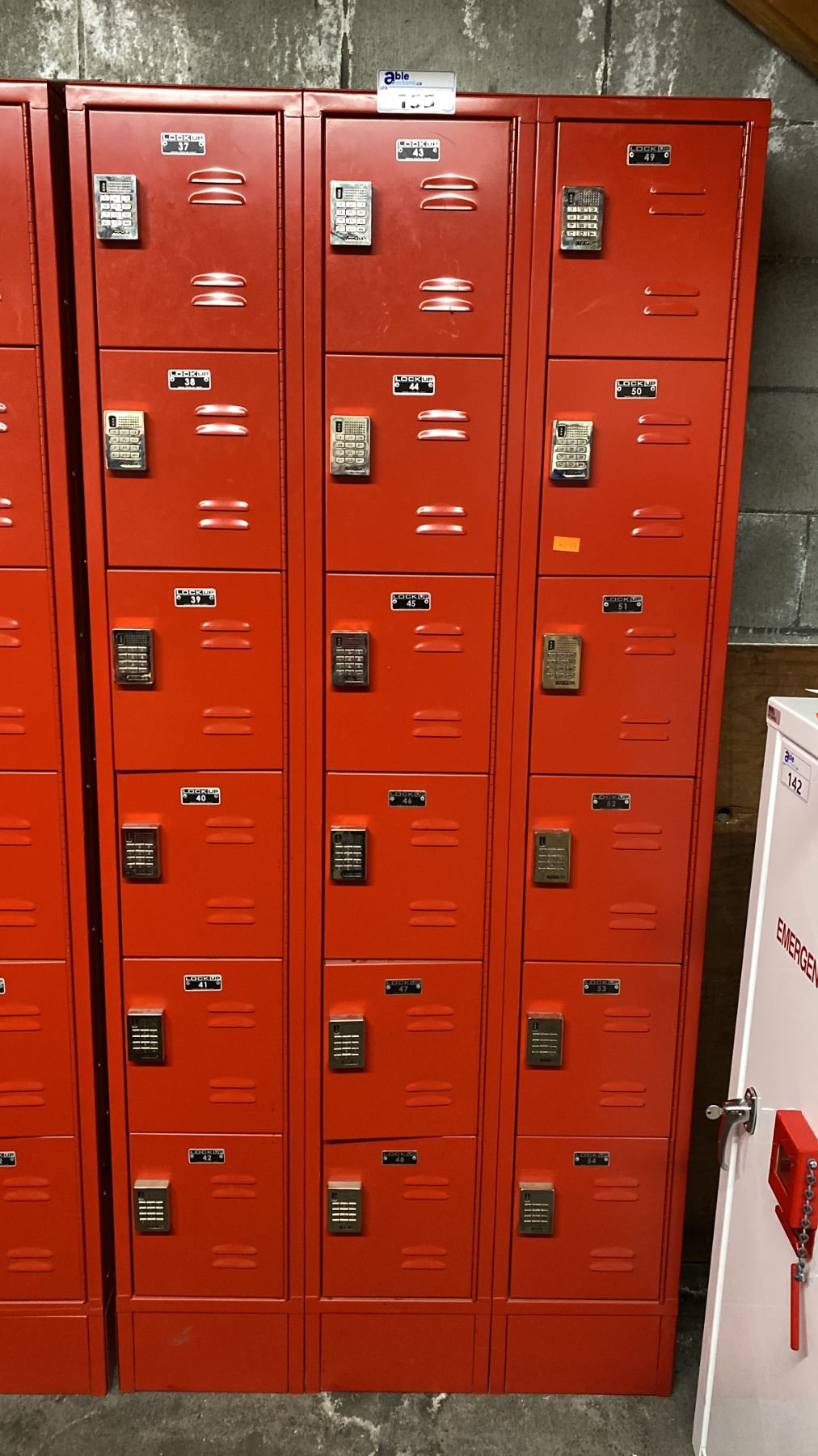 LOCK UP 3 BAY 18 DOOR RED LOCKERS WITH PROGRAMMABLE DIGITAL LOCKS & MASTER KEY UNIT MEASURES APPROX 36"W X 11"D X 78"H