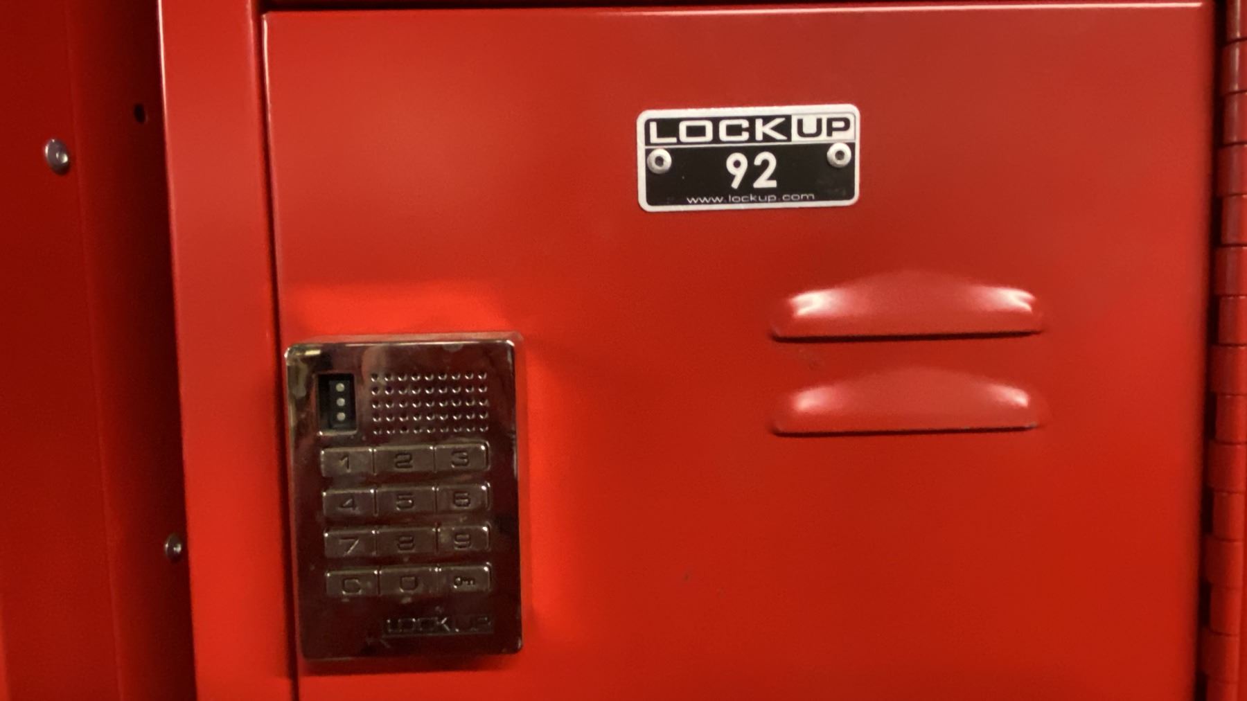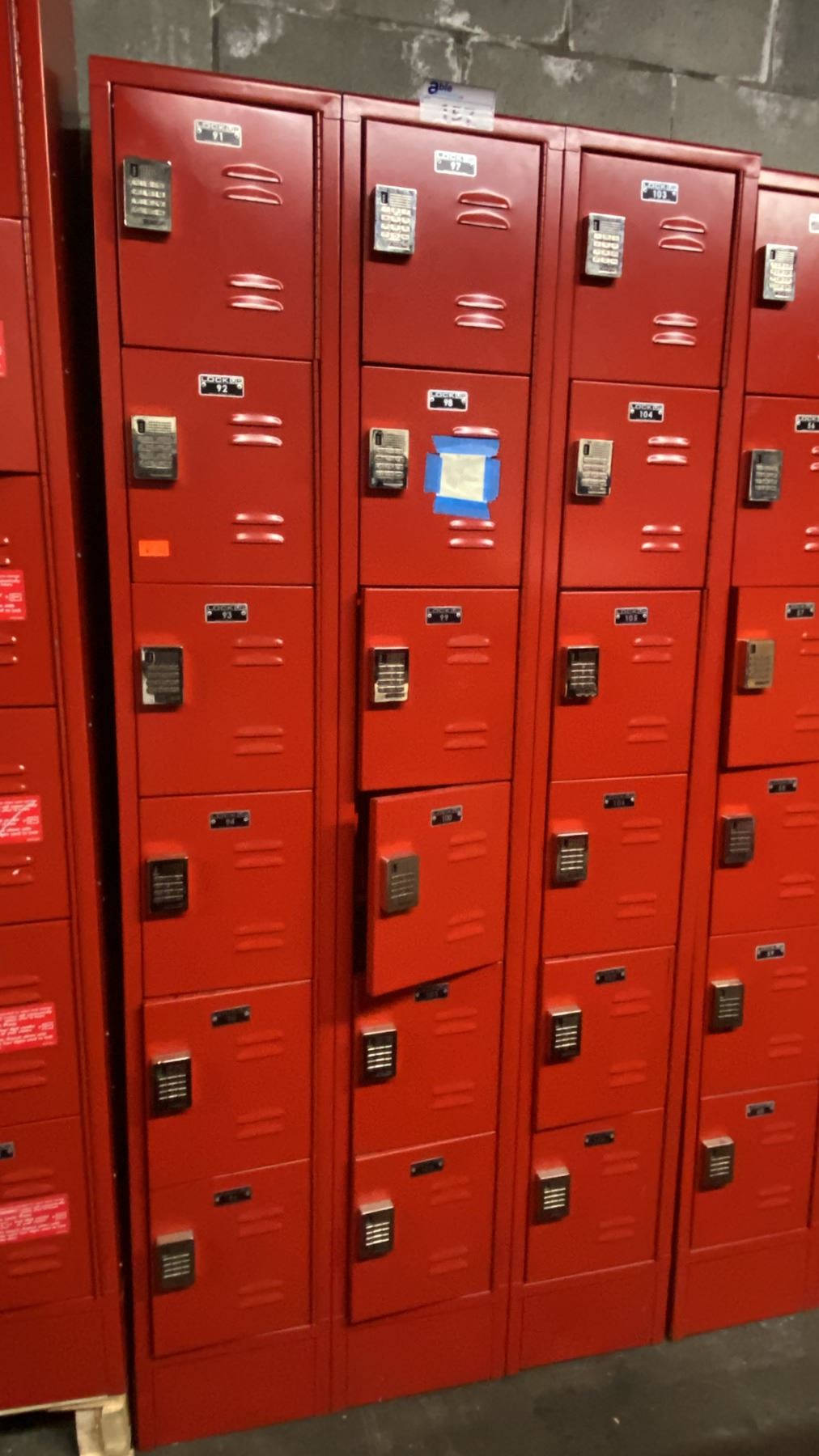 LOCK UP 3 BAY 18 DOOR RED LOCKERS WITH PROGRAMMABLE DIGITAL LOCKS & MASTER KEY UNIT MEASURES APPROX 36"W X 11"D X 78"H *LOCKER 98 IS BROKEN"