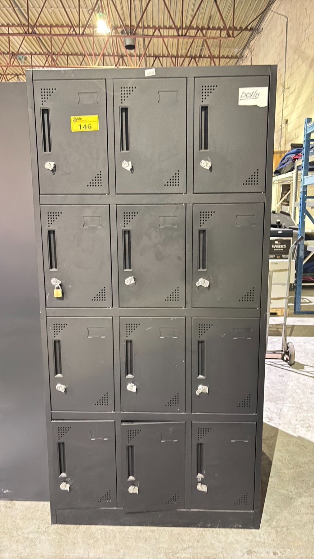 LOCKER CABINET WITH 12 LOCKERS AND CONTENTS (NO LOCK KEYS)