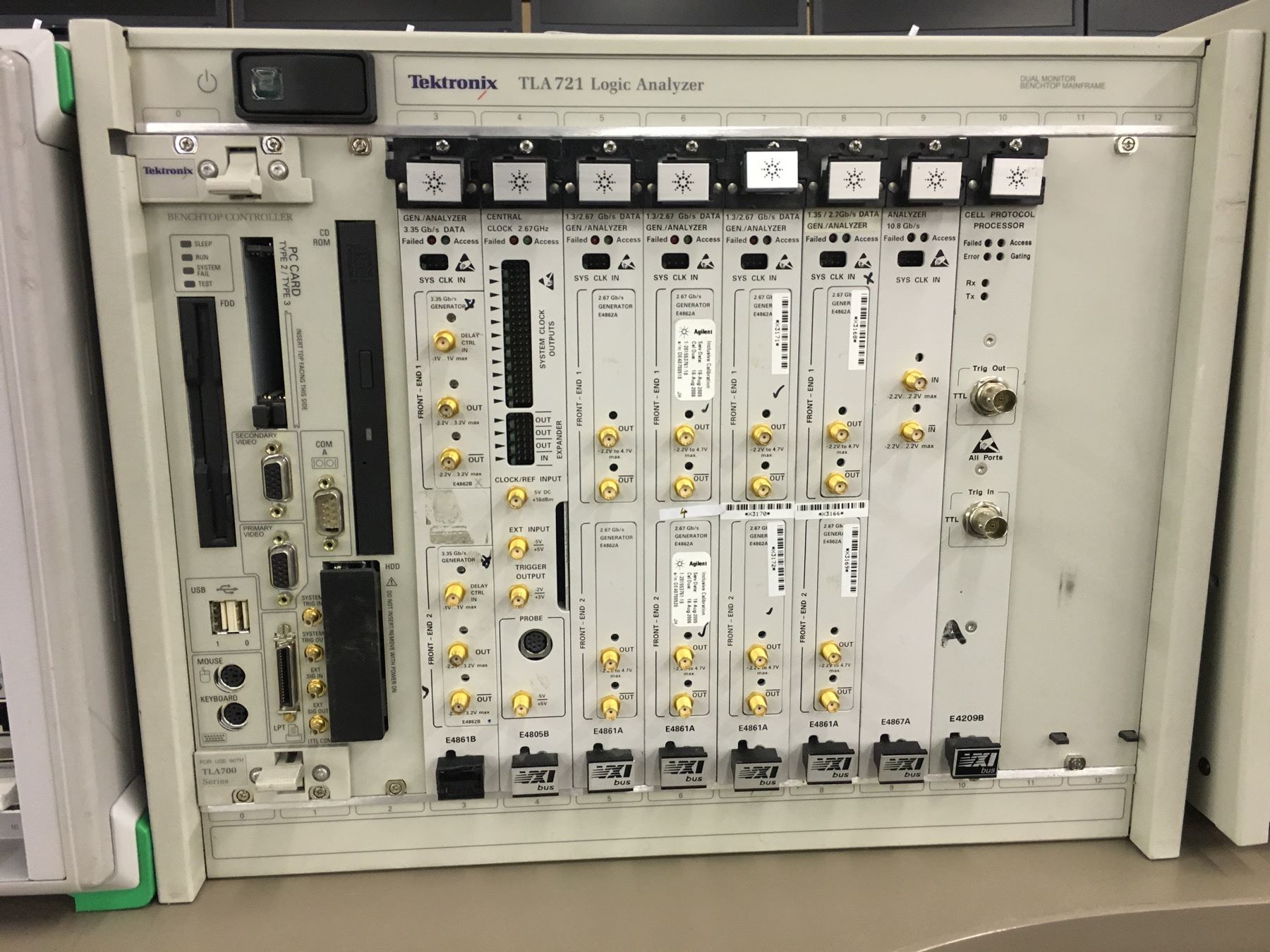 LOGIC ANALYZER UNITS INCLUDING: 4X AGILENT E4861A 1.3/2.67 GIGABIT/S GEN./ANALYZER UNITS, 1X E4861B 3.35 GIGABIT/S DATA GEN./ANALYZER, E4805B 2.67 GHZ CENTRAL CLOCK, E4867A 10.8 GIGABIT/S ANALYZER, AND E4209B CELL PROTCOL PROCESSOR, ALL UNITS INSTALLED IN TLA721 LOGIC ANALYZER MAINFRAME WITH TLA700 CONTROLLER MODULE