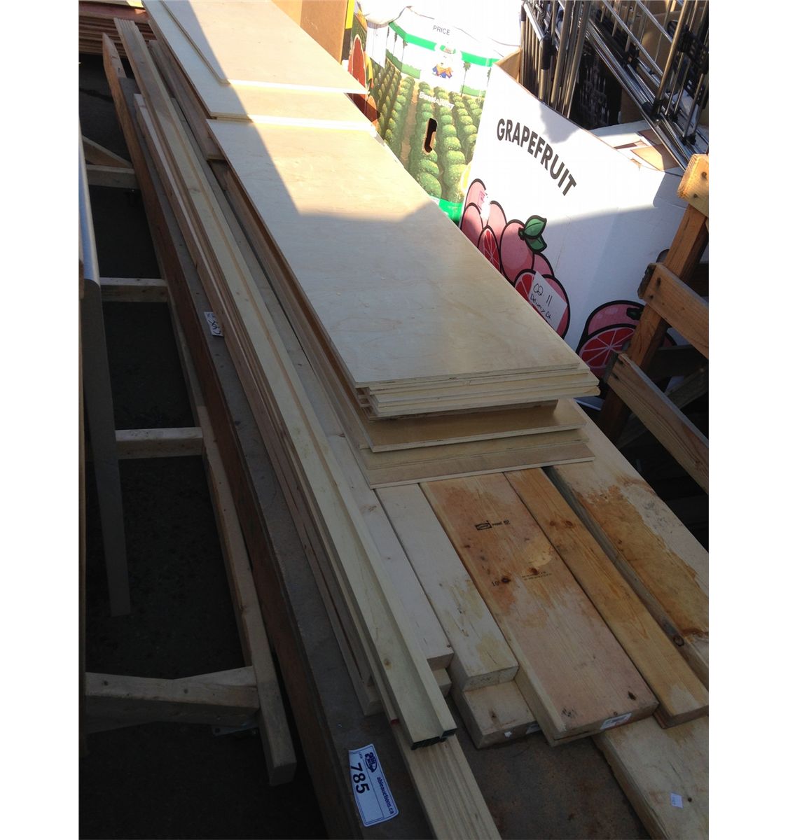 LONG WOODEN SHOP PLATFORM DOLLY LOADED WITH ASSORTED CABINET SHOP WOOD PIECES