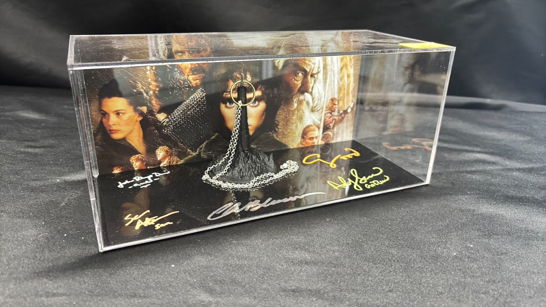 LORD OF THE RINGS THE ONE RING PROP IN DISPLAY CASE AUTOGRAPHED BY ORLANDO BLOOM, ELIJAH WOOD, SEAN