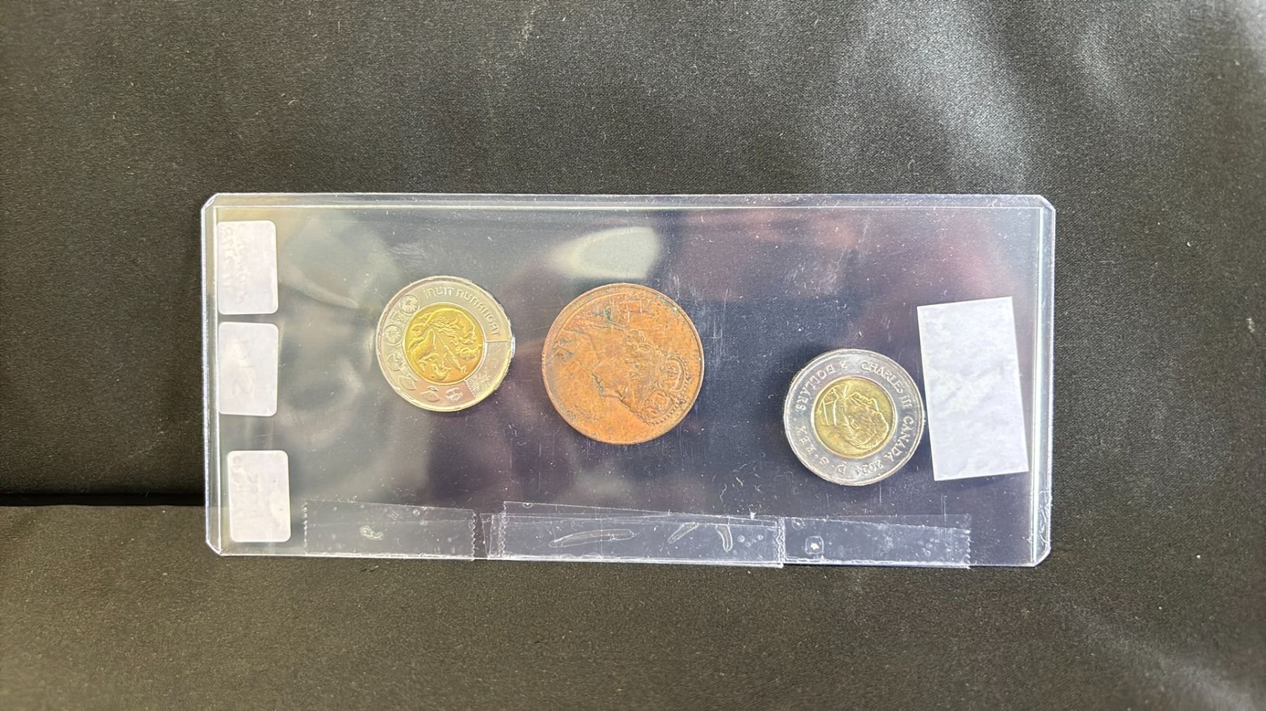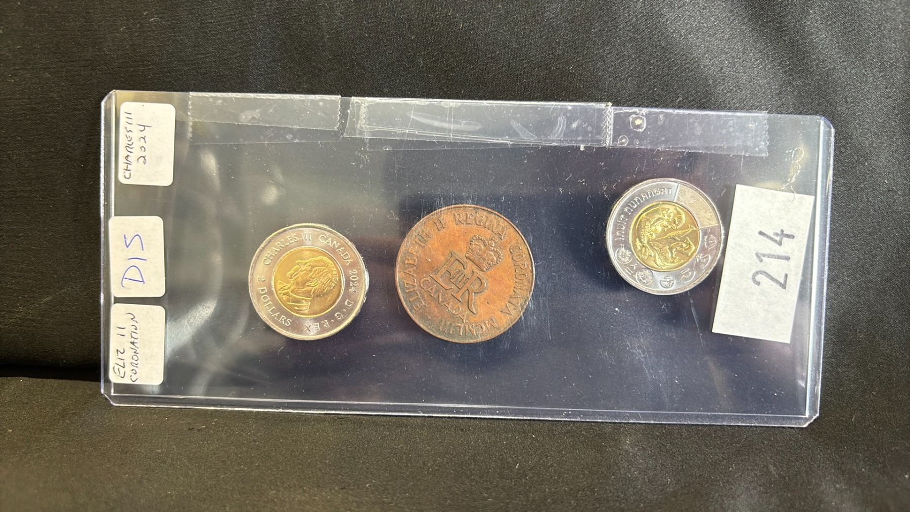 LOT ELIZABETH II CORONATION TOKEN (1). CHARLES III INITIAL RELEASE 2 DOLLAR COINS (2)