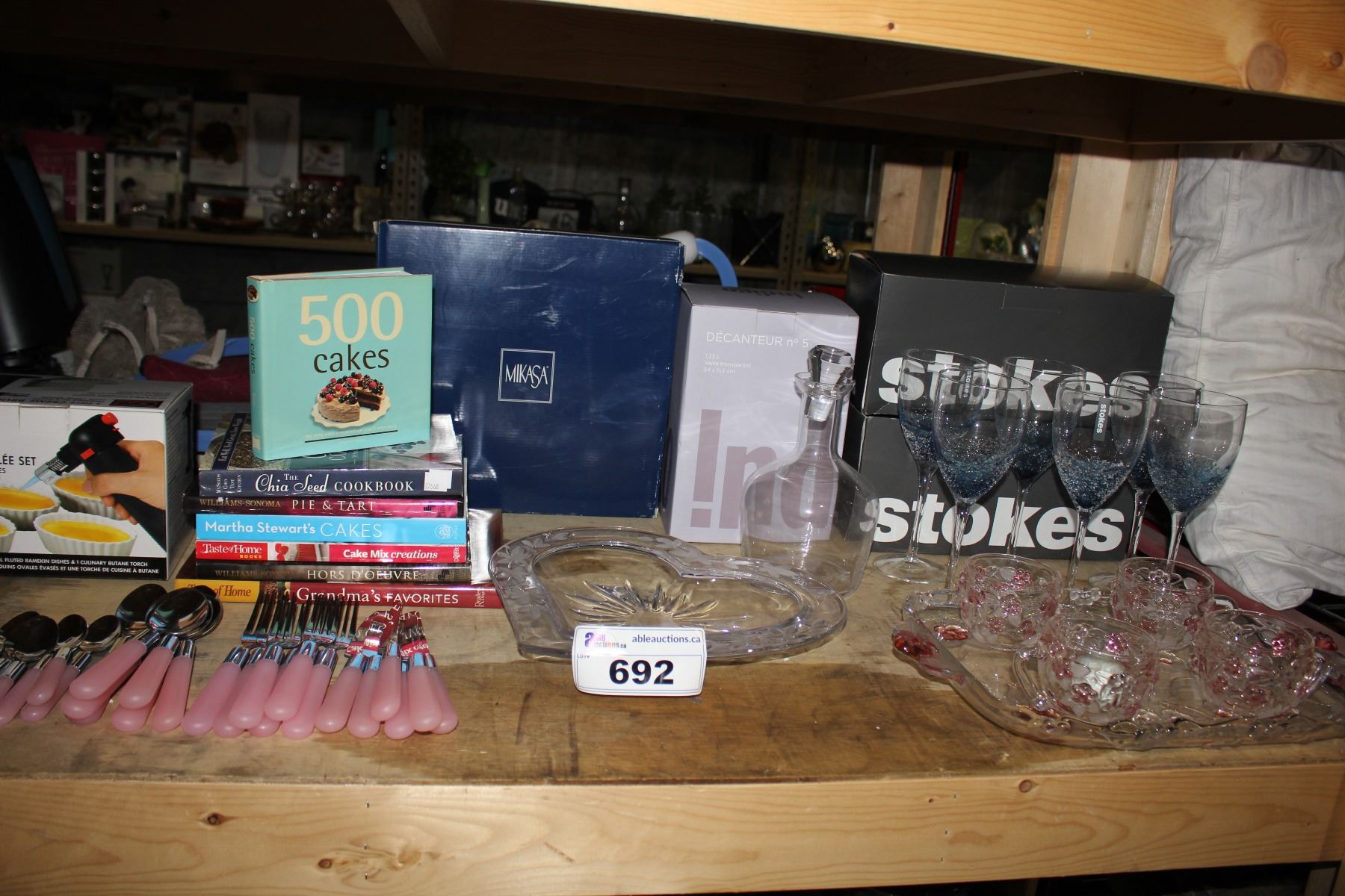 LOT INCLUDING COOK BOOKS, CREME BRULEE SET, DECANTER, GLASSWARE AND MORE