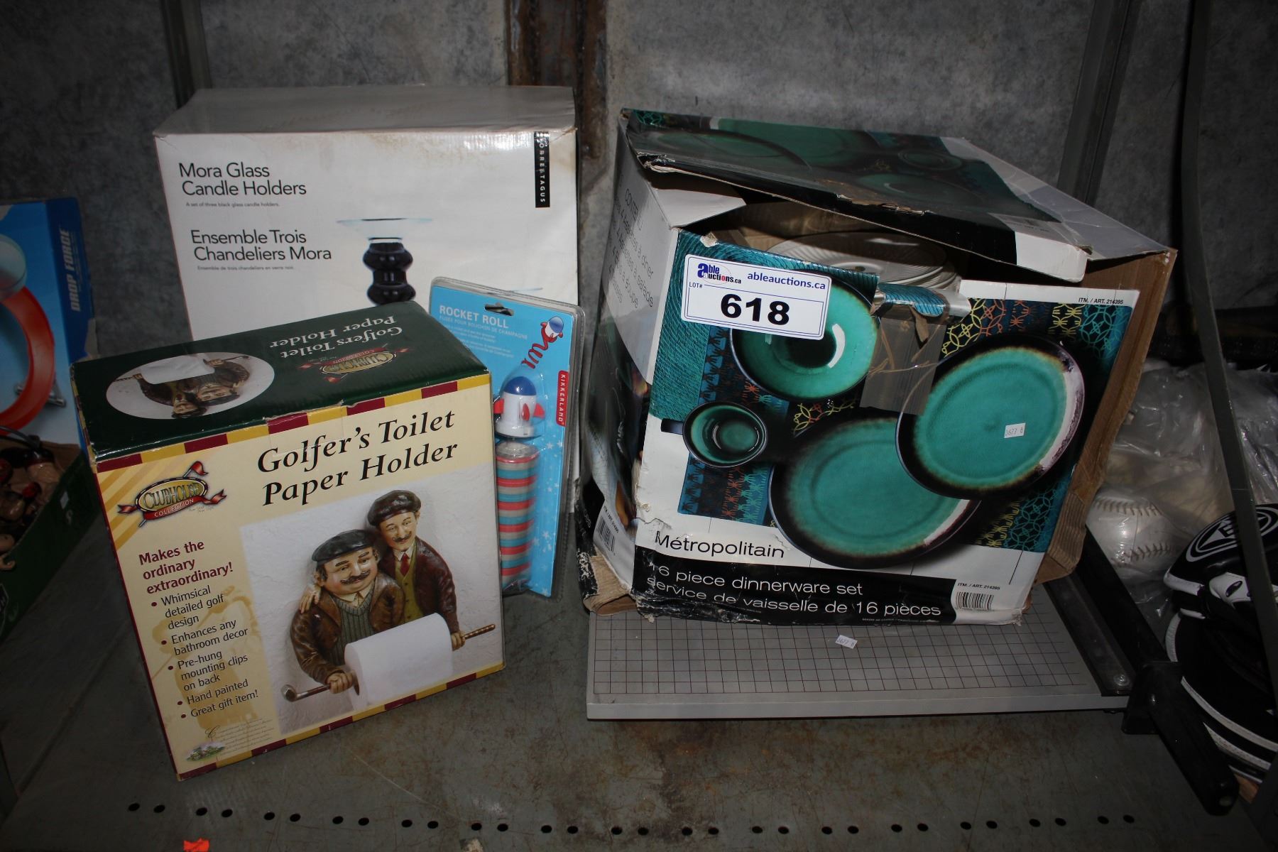 LOT INCLUDING DISH SET, GOLFER'S TOILET PAPER HOLDER, MORA GLASS CANDLE HOLDERS, PAPER CUTTER AND MORE