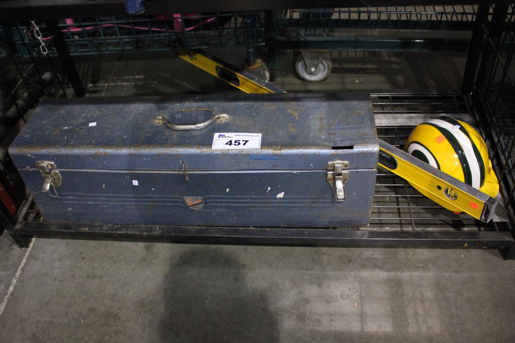 LOT INCLUDING JOHNSON LEVEL, HARD HAT AND TOOL CHEST WITH CONTENTS