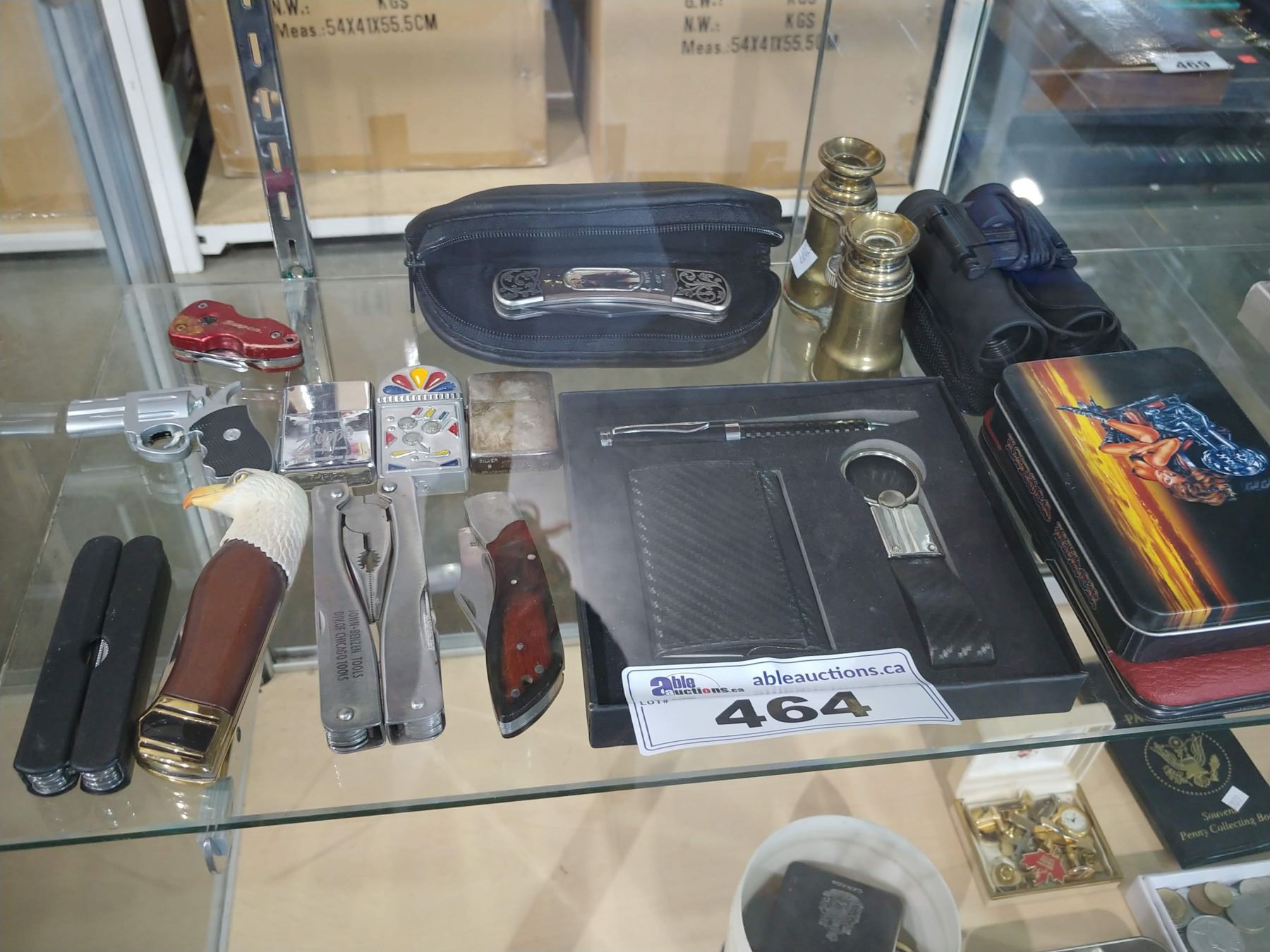 LOT INCLUDING LIGHTERS, POCKET KNIVES, BINOCULARS AND MORE